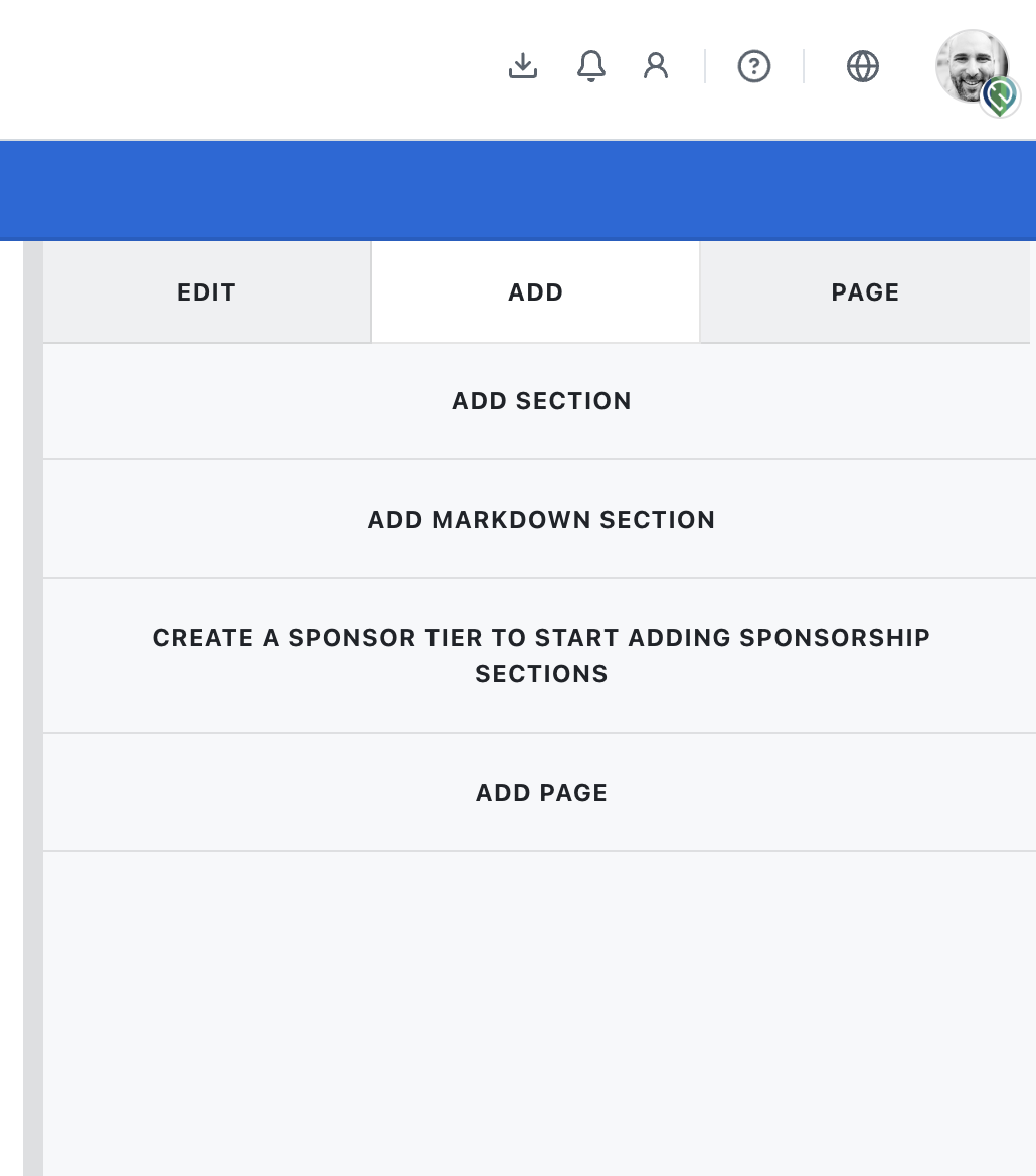 To begin adding a section to your microsite, click on the 'Add' option on the right-hand side of the microsite editor. You will see section types available:
