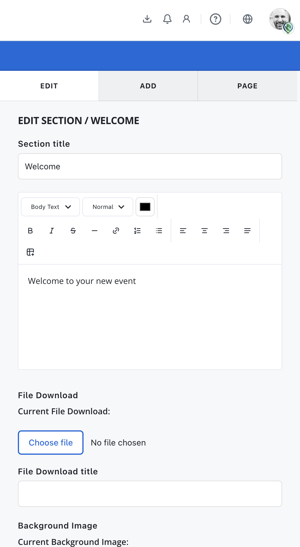 - Background Image - this option provides you with the ability to add a 'background' image for your section. When you create multiple sections for your site, getregistered® will provide you with alternating colored backgrounds by default... but if you want to personalize your microsite, upload an image here and make it your own!