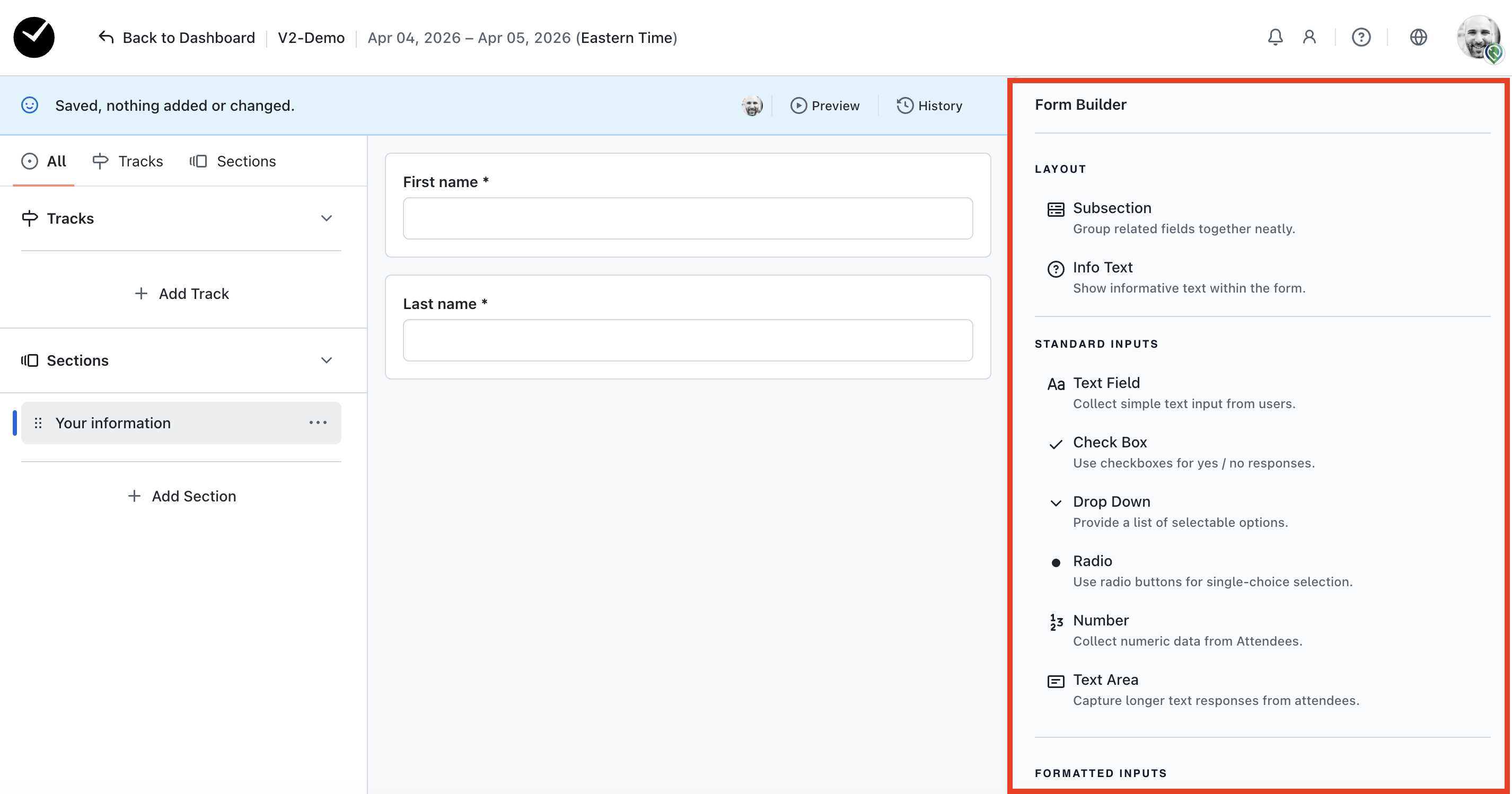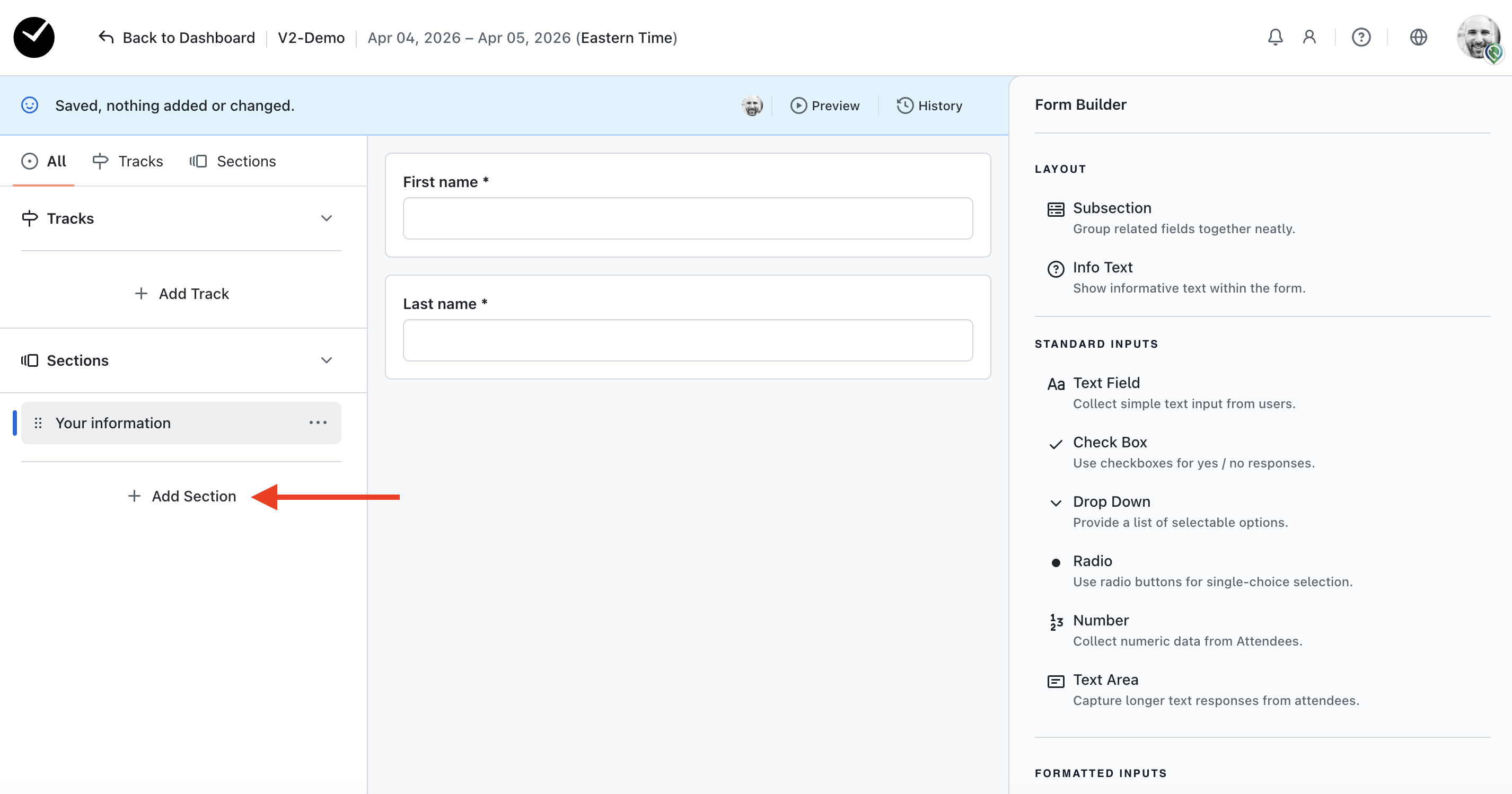 From here you can add sections, fields and tracks to your event registration form. To begin adding new sections to your registration form, click on the 'Add Section' button displayed on the left hand column: