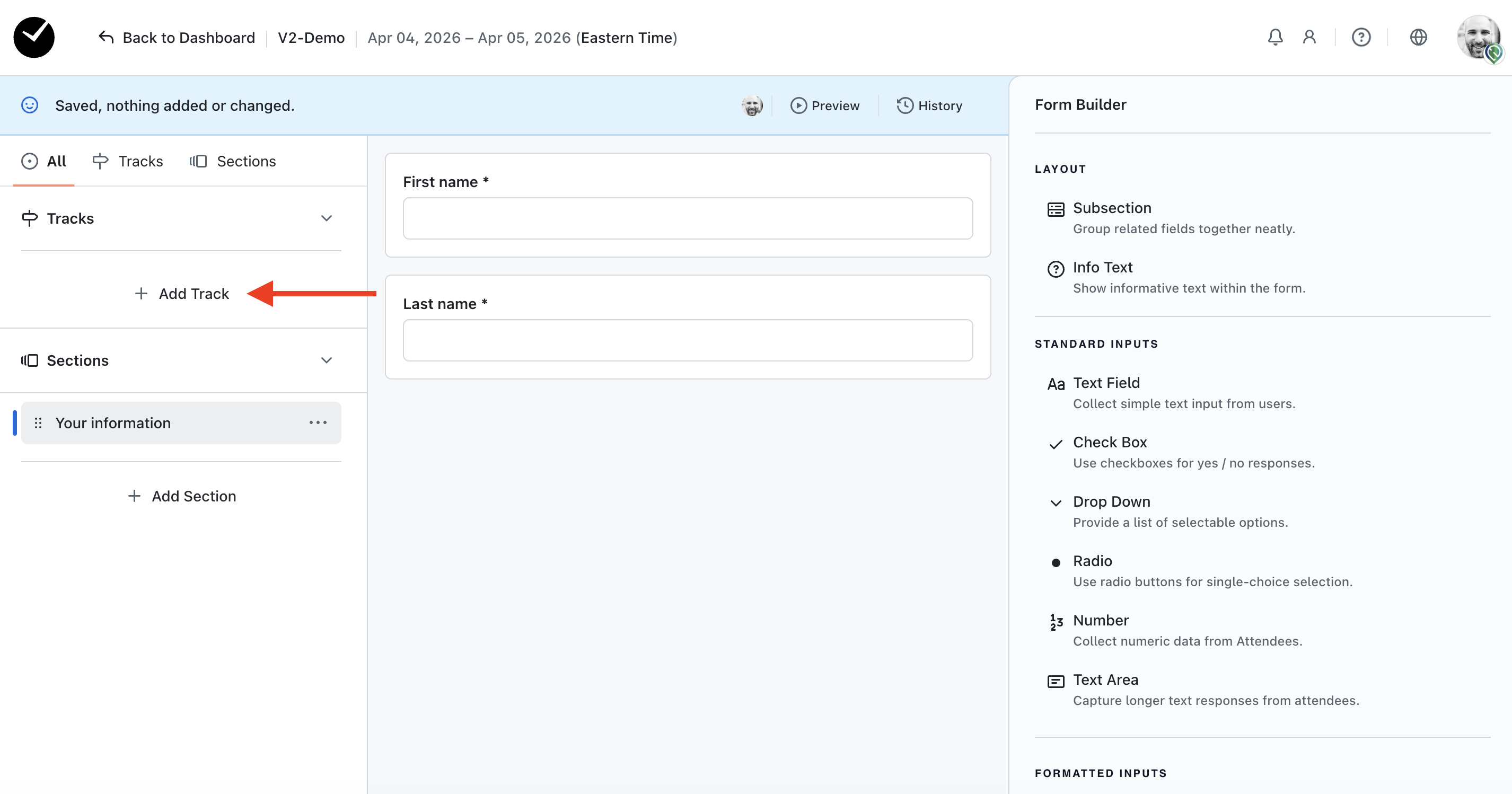 And to begin adding tracks to your registration form, click on the 'Add Track' button on the top left area of the left-hand column: