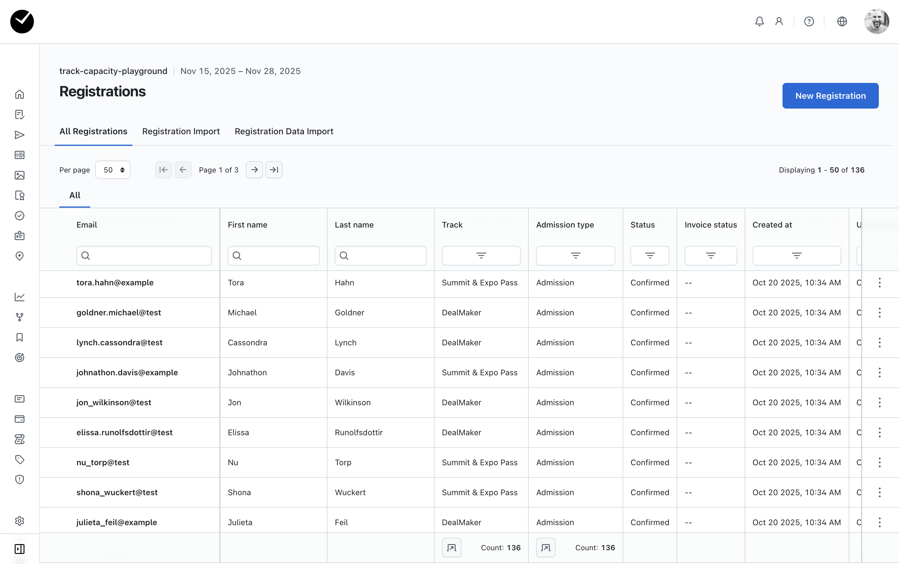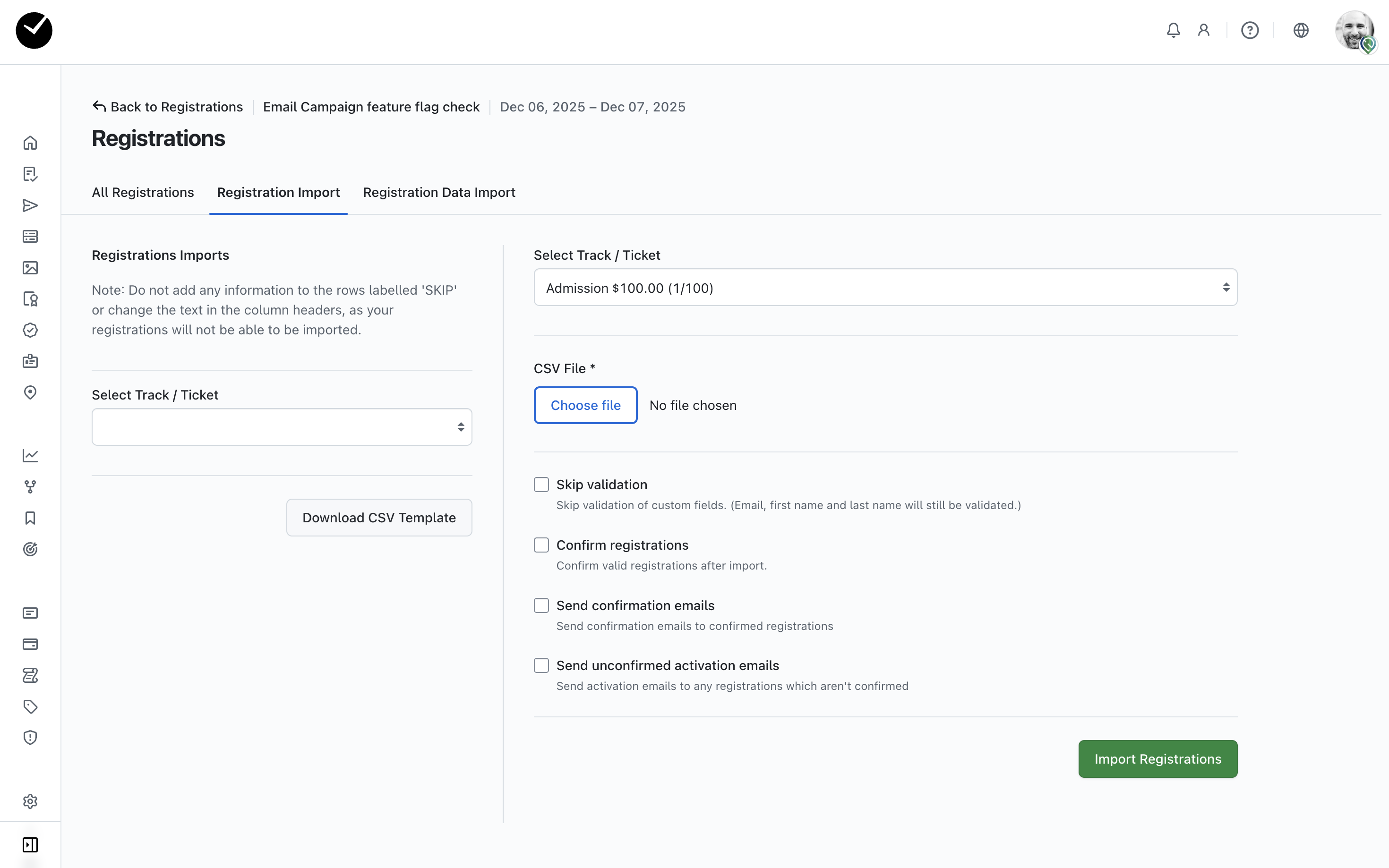 To create multiple registrations at once, you can enter the 'Registrations Import' area (by clicking on the option adjacent to the 'All Registrations' tab) and then select the 'New Registration Import' button at the top right of the page. From here, you can then upload a CSV containing registration information for multiple new attendees.