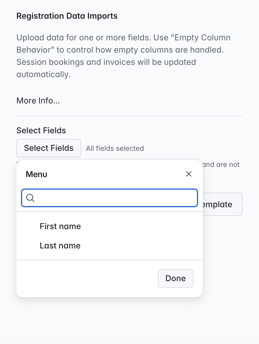 Simply select the fields you wish to update for the registrations and click 'Done'. Select to download you new CSV template, update the CSV as required and when you're ready to import, upload your CSV and click on the 'Import Registration Data' button to submit.