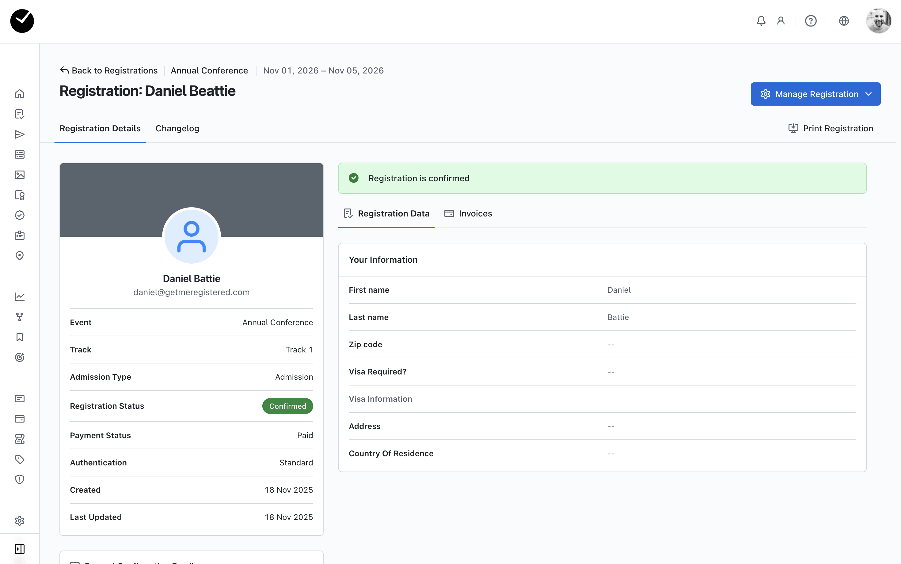 This will take you to directly view the attendee's registration - from here you can view their submitted information, amend their registration if required using the 'Manage Registration' menu (top right), and also view any recent changes made to the form by the attendee by selecting the 'Changelog' tab. You can easily return to the 'Registrations' area of your event by clicking the 'Back To All Registrations' option.