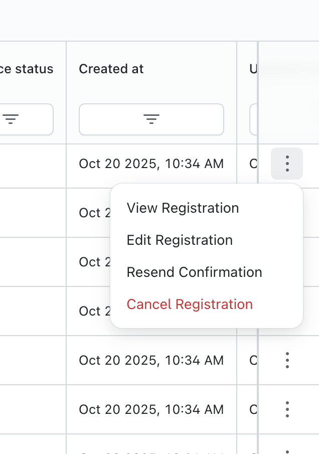 You can view, edit, resend or cancel a registration using the tools on the right side of the Registrations page.