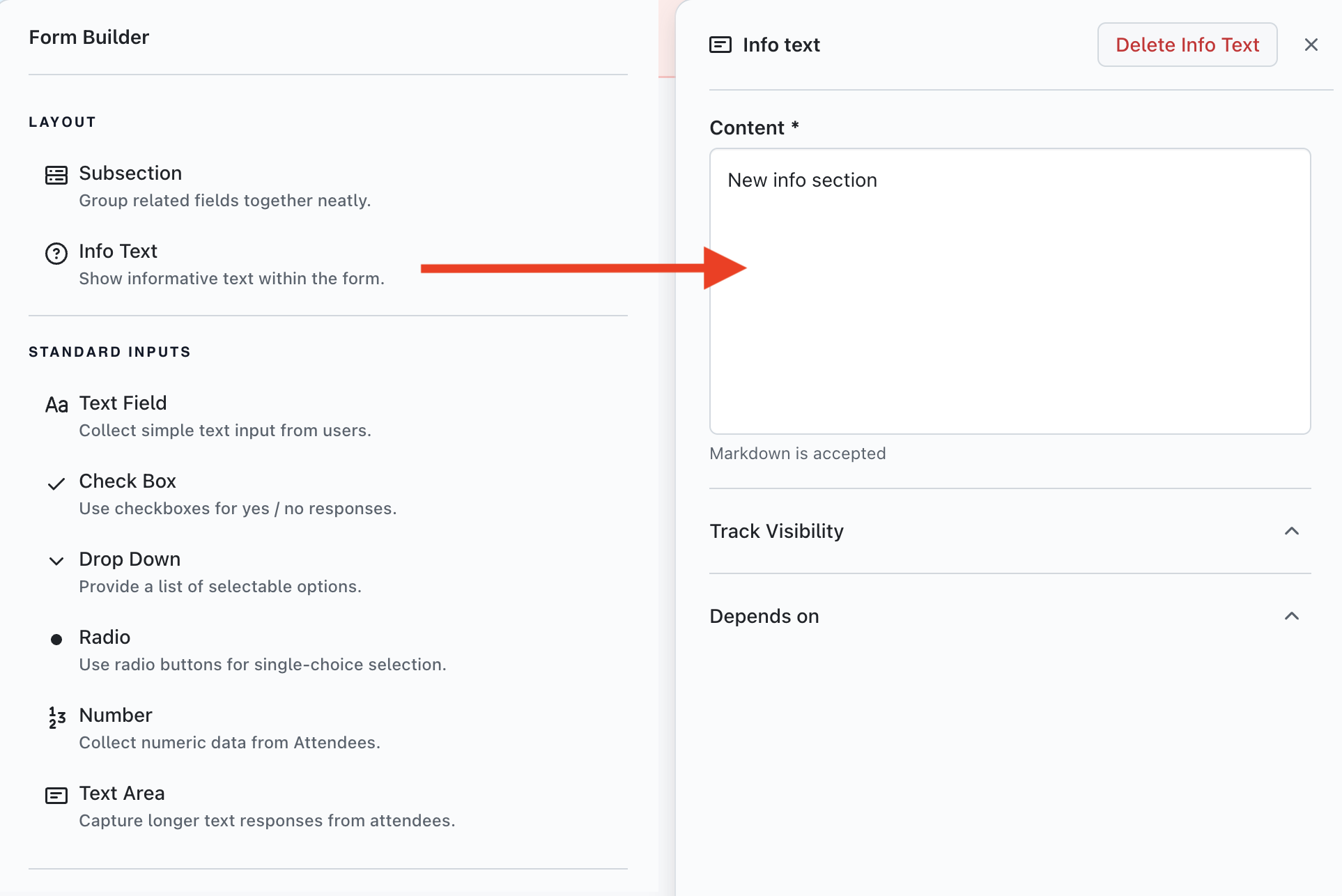 To add an 'Info Text' field to your registration form, first ensure that you have the correct Section selected by clicking on the Section name displayed on the left-hand column. Click on the 'Info Text' button on the 'Form Builder' column (right-hand side) and the new field will be displayed on your form in the center of the page. The new 'Info Text' field can be dragged and dropped into the order you would like it to appear if required.