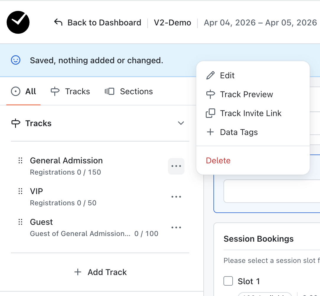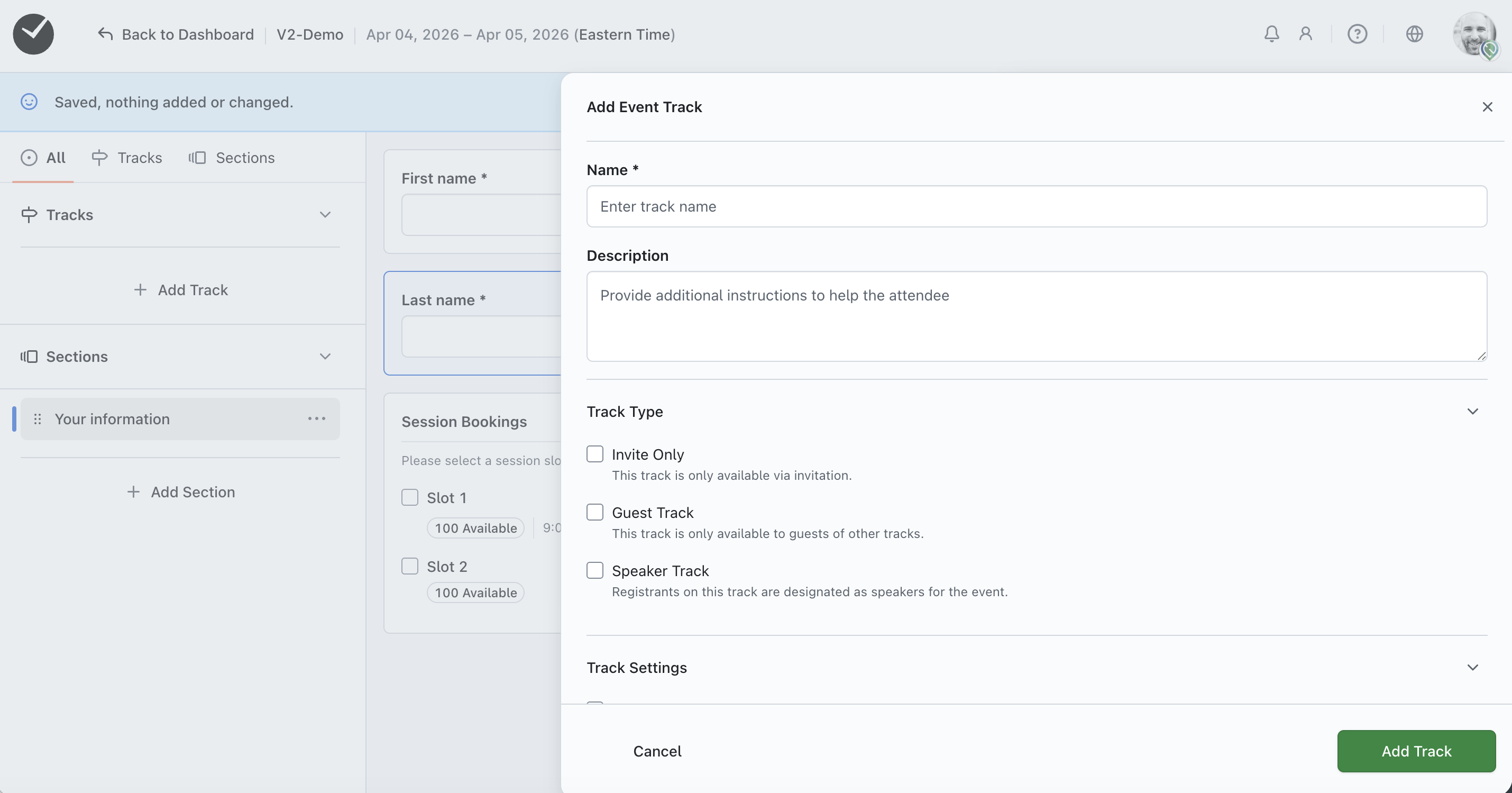 Tracks are custom registration paths through your event. They allow you to set custom fields, sections, pricing, and capacity for different attendee registration types. Using tracks allows you to do things such as having different questions for VIP registrations, or charging different prices to vendors.