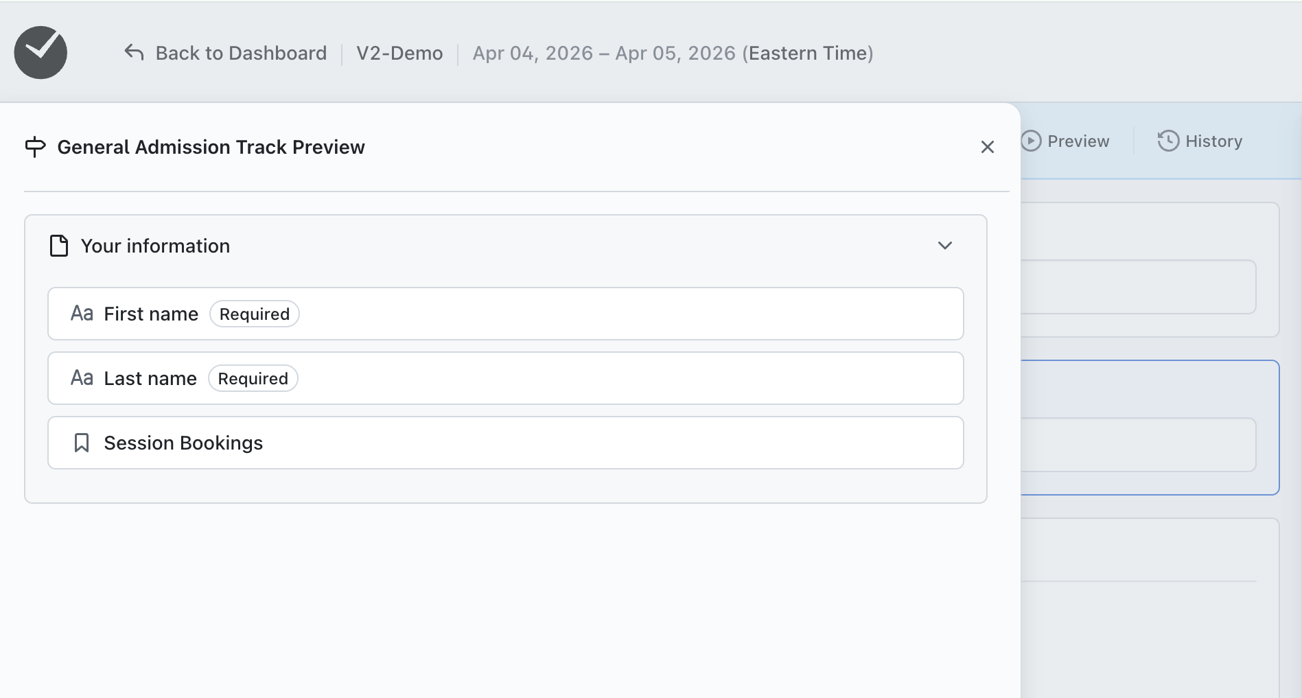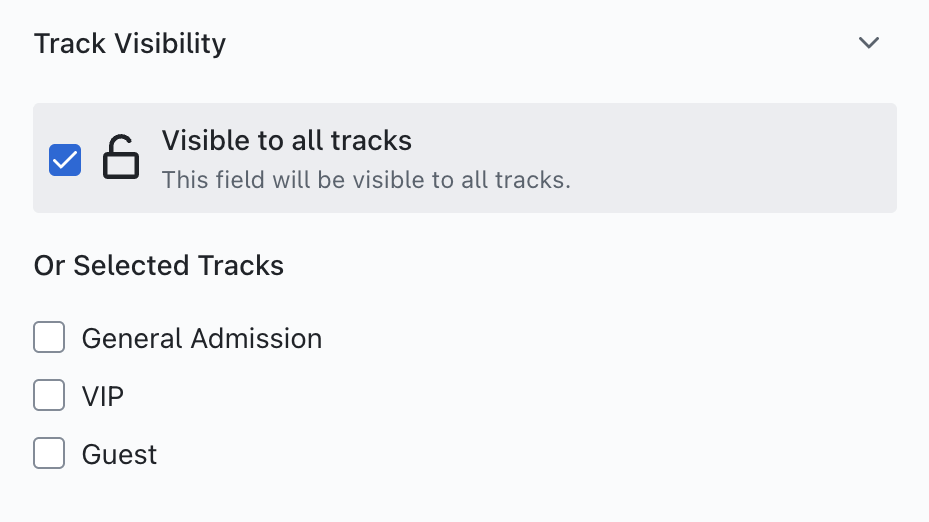 You can fully customize the registration experience for each track by assigning sections, fields and widgets to specific tracks only (default setting for all sections and fields is 'Visible to all tracks').