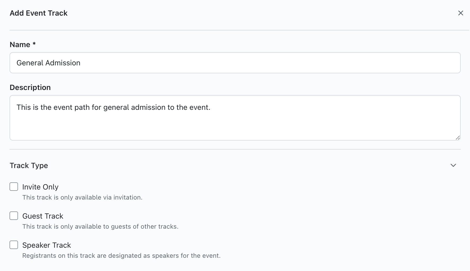 - Speaker Track - sets the track to be a 'speaker' track. When set, any attendee registering under this track will be captured as a 'speaker' at your event.