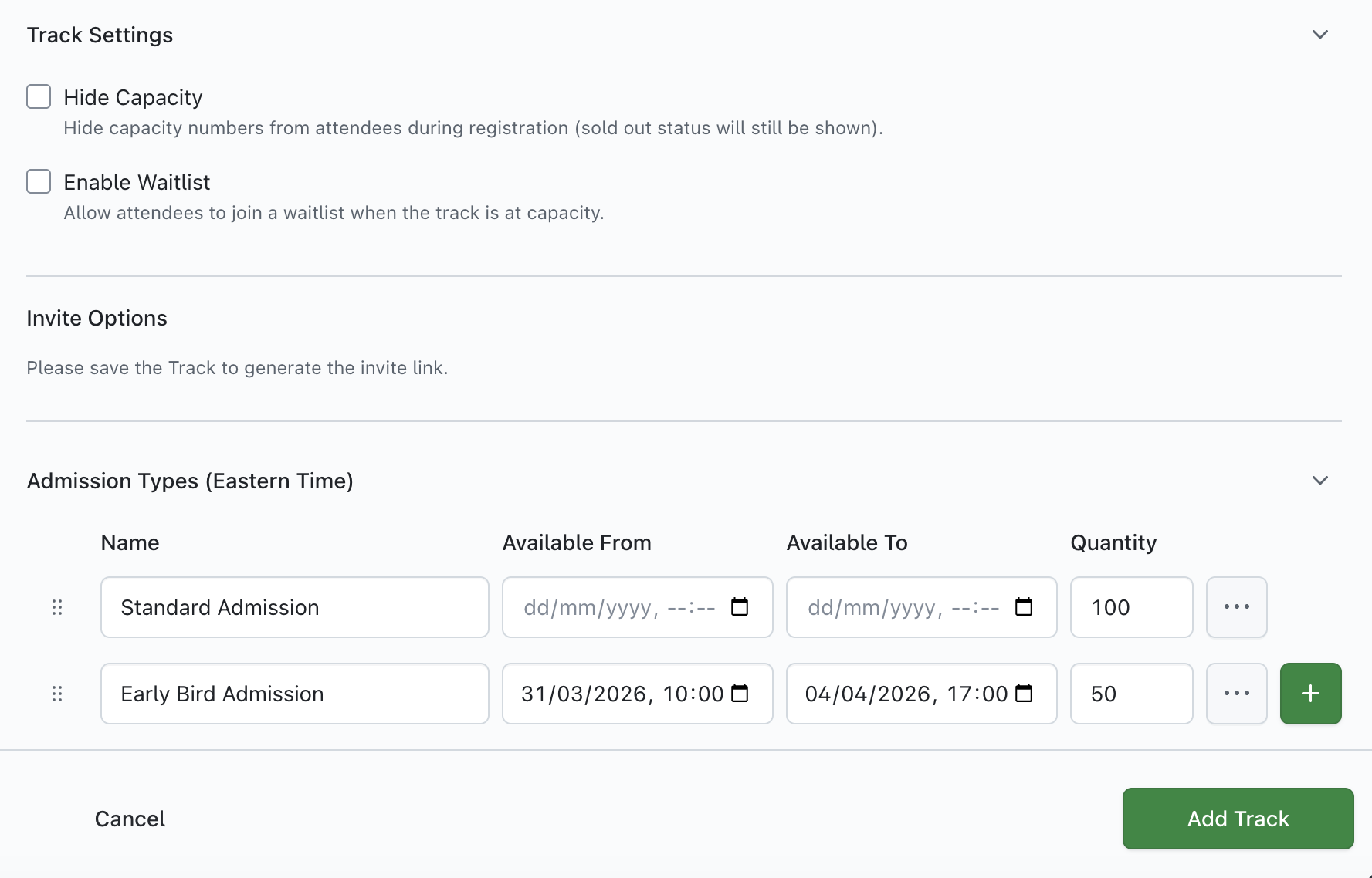 Guest tracks can also have multiple admission types and pricing applied, as well as hiding capacity. However, guest tracks cannot be 'waitlisted'.
