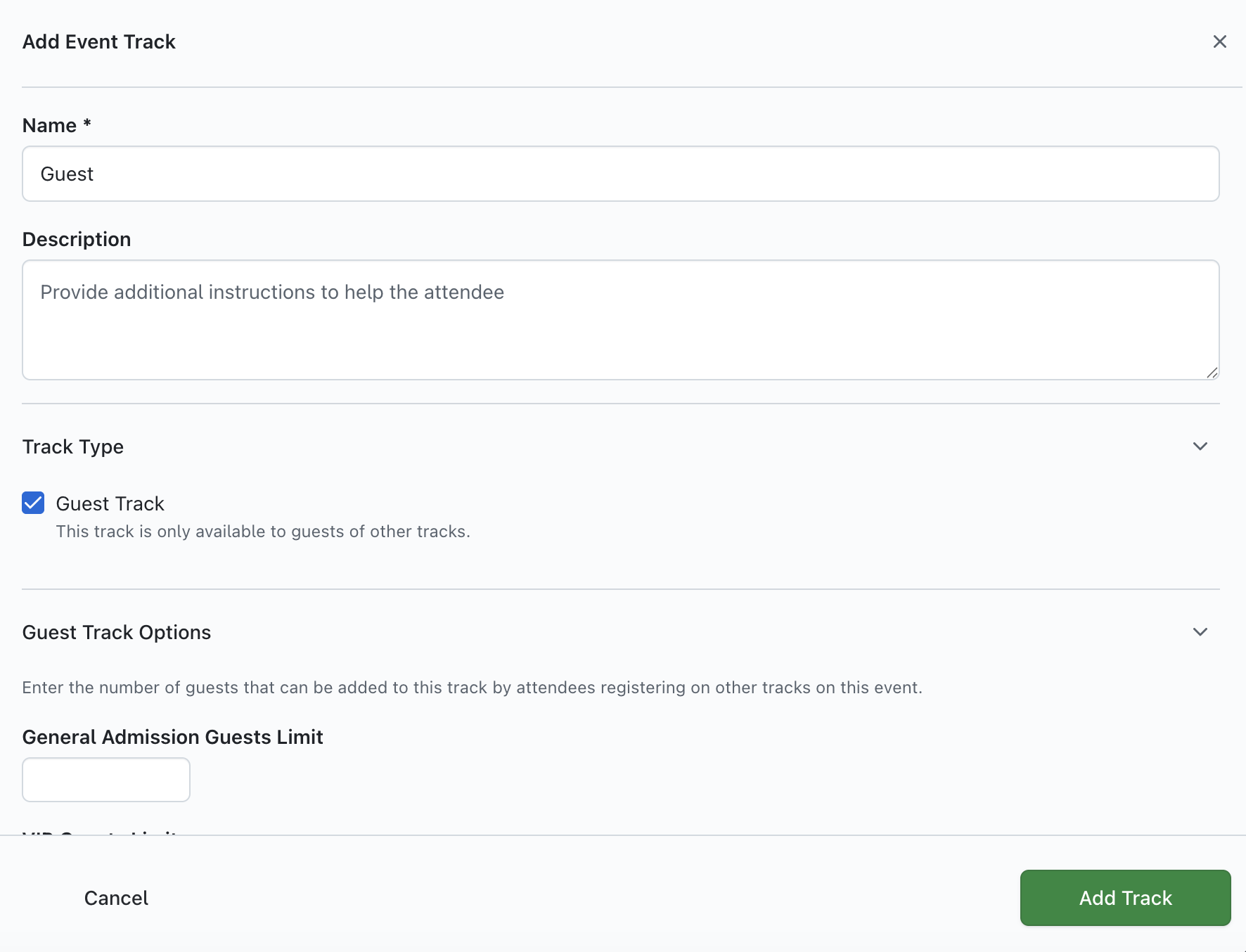 - Guest Track - sets the track to be a 'guest' track. When set, main attendee tracks will be able to add additional attendees under the track as a 'guest' when registering. More details on this option are available later in this article.