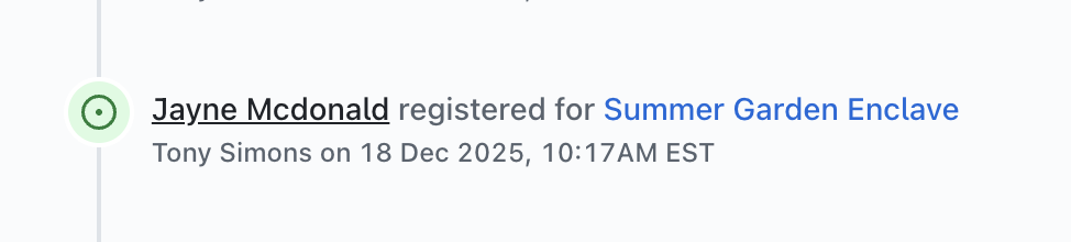 Again, this feed does not show any detailed information in regards to the exact changes made, just the action made (eg 'registered', 'updated', 'cancelled' etc). To view the event area/registration where the change was made, click on the linked item (which is underlined).