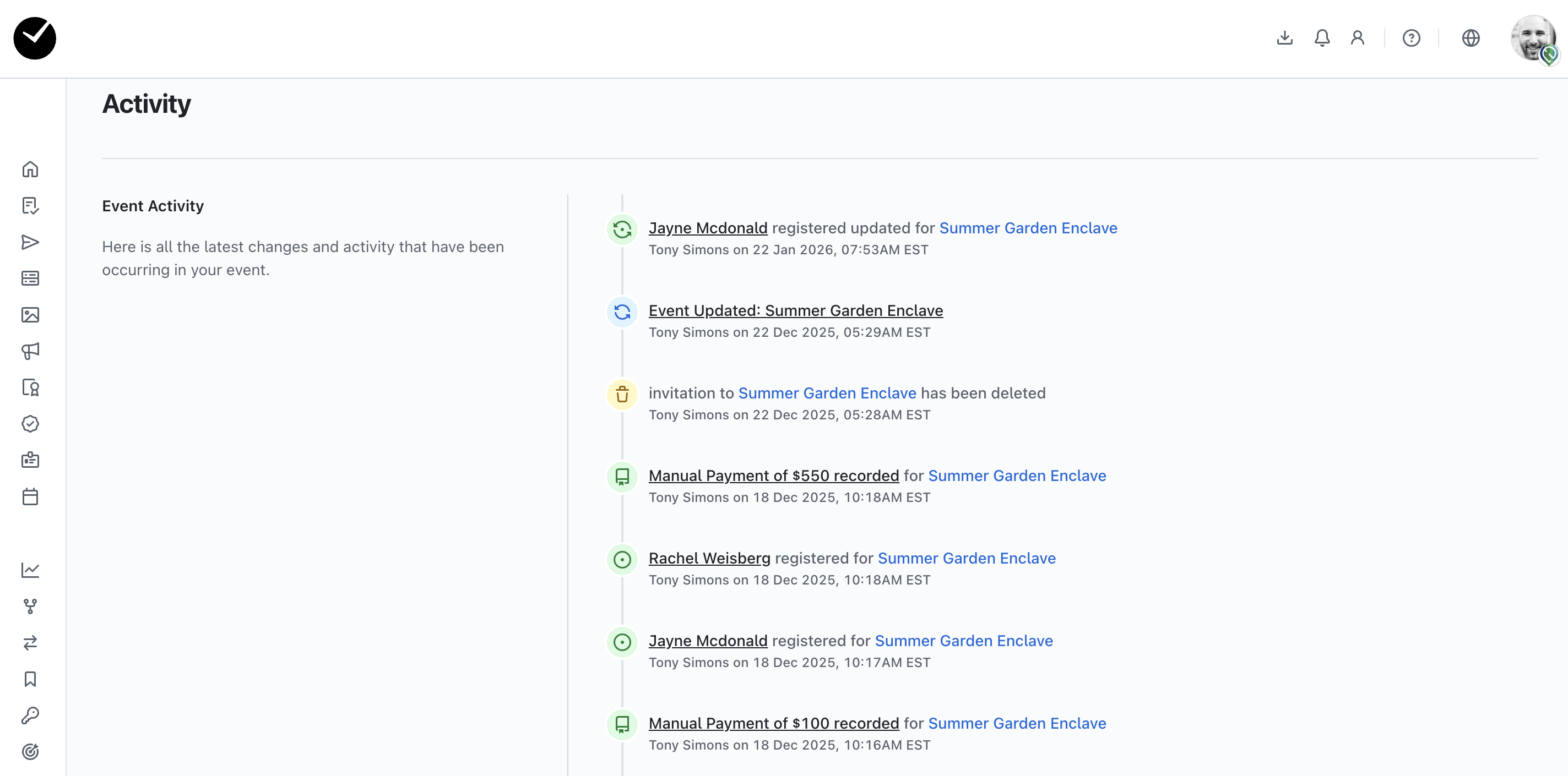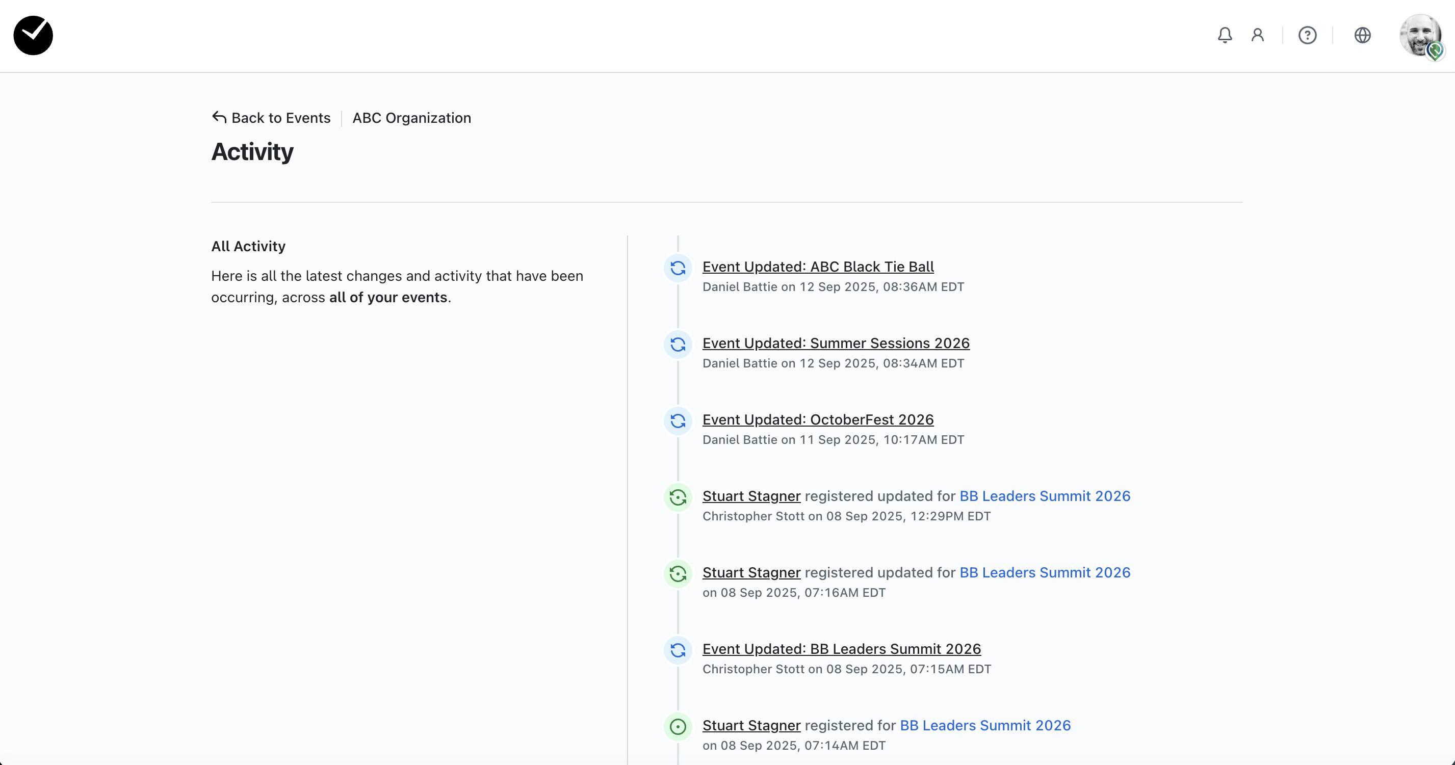 You can view a global newsfeed of the latest changes within all your events at any time, by clicking on the 'bell' icon displayed at the top right of your Organization Dashboard.