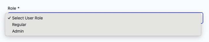 Create a new user by clicking on the blue button at the top right corner and enter their email along with all required information. i.e. Role*