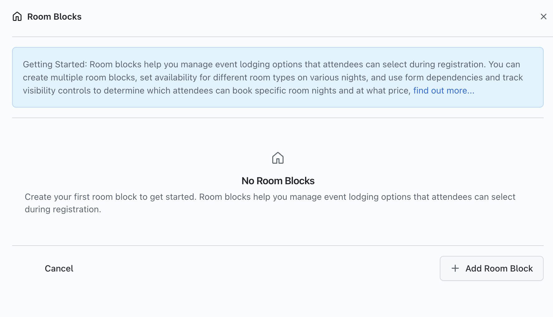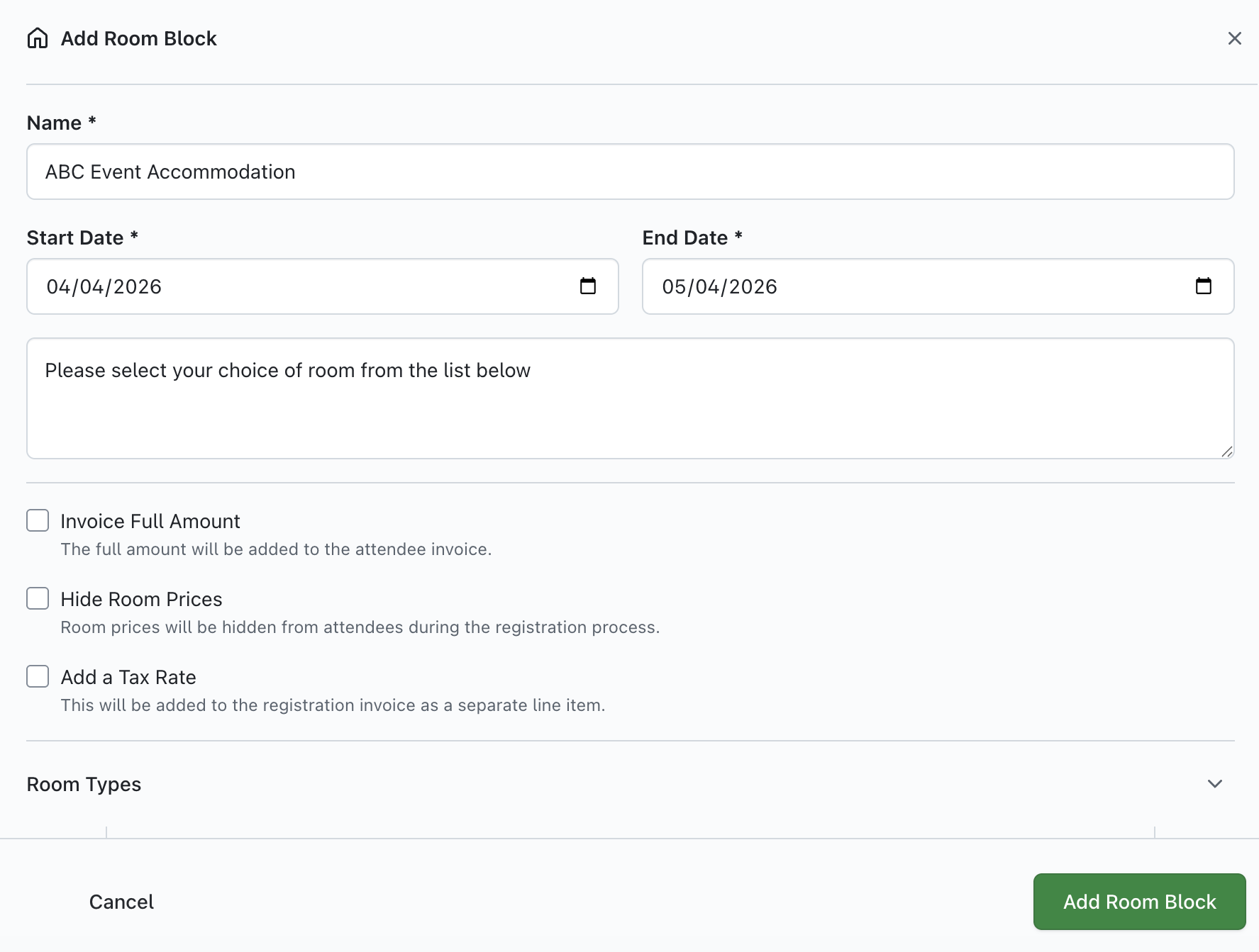 To proceed, click on the 'Add Room Block' button and you will see the 'Add Room Block' form displayed: