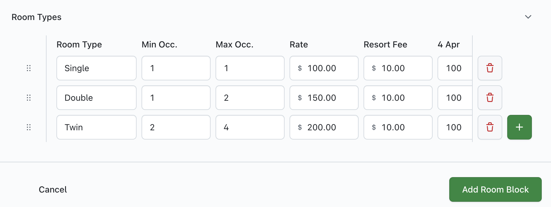 Once you have configured your initial settings, you will next be creating your 'Room Types'. Each 'Room Type' will be shown to the attendee (based on availability) as configured using the fields on the grid below. To add or delete 'Room Types', click on either the green '+' icon (add) or red 'trash can' icon (delete) - you must have at least 1 Room Type to use the 'Room Block' feature: