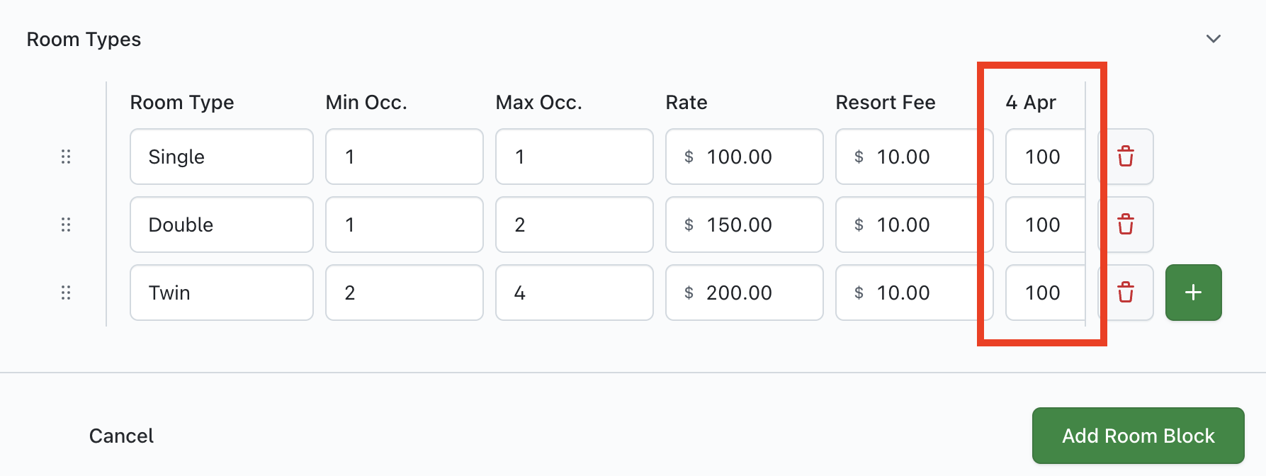 To increase/decrease capacity, you must enter the required number of nights available into the relevant field under each date on the grid. For example, in the image below, you can see that '4 Apr' has 100 added in each row: