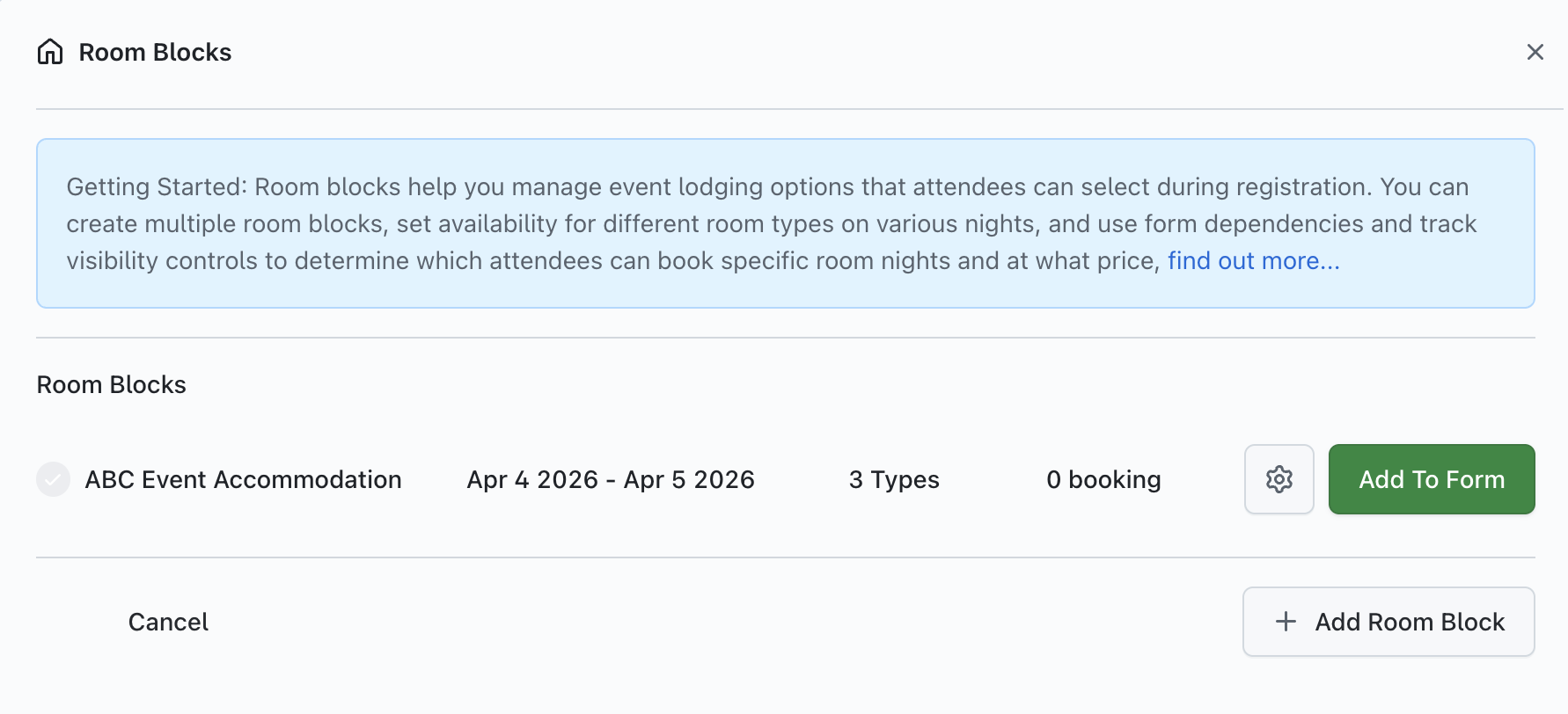 Once you have at least one Room Block created, you can add it to your registration form by opening the Room Block window (as demonstrated in the image above) and selecting the 'Add To Form' button.