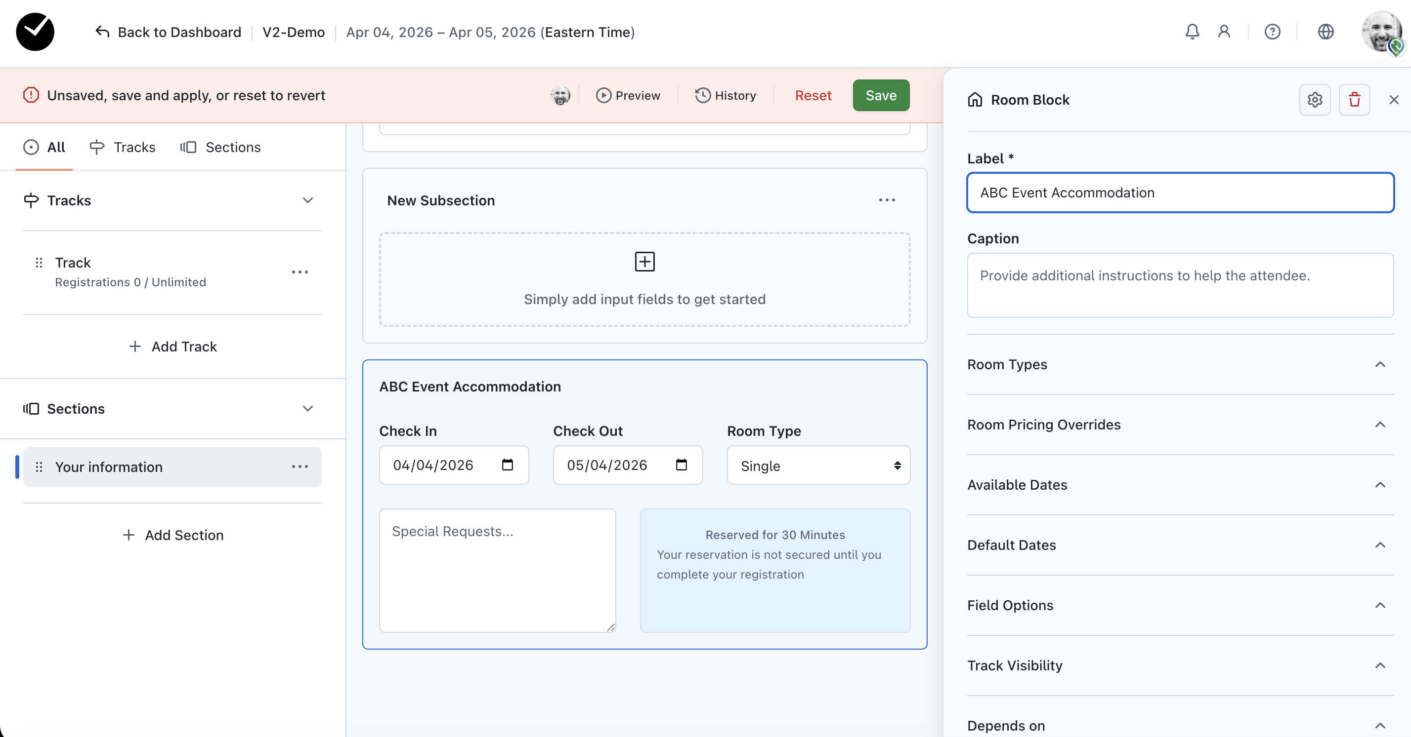 - Start/End Dates - these fields set the start and end dates for your room block. They will be set to default to your event start/end dates, but can be configured to less/more if required.