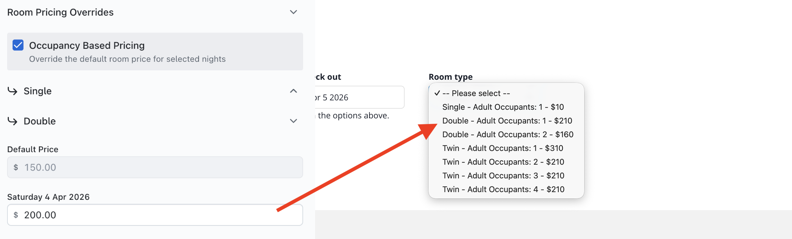 The example above shows that the Room Type 'Double' (which has a minimum occupancy of 1, max of two) has been set to override the default price to $200. When the attendee looks at the form, if they select the option with 'Adult Occupants: 1', the price override is applied. If the occupancy is more than 1, then the price override is not applied.