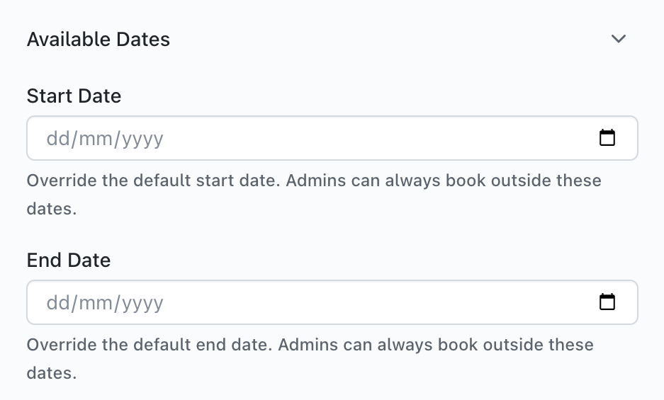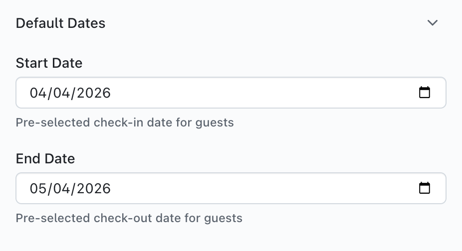 This area allows you to set the default booking dates available your room block. This feature allows you to quickly adjust the amount of nights available without having to enter the Room Block editor and change them there.