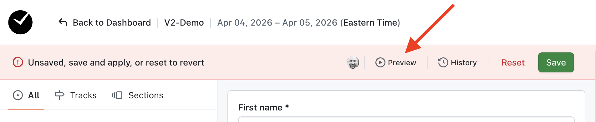 Clicking on this will open a new tab in your browser, showing you exactly what an attendee would see in your event when attempting to register for it. If your registration form has tracks available, you can also preview the registration path for any of the tracks added.