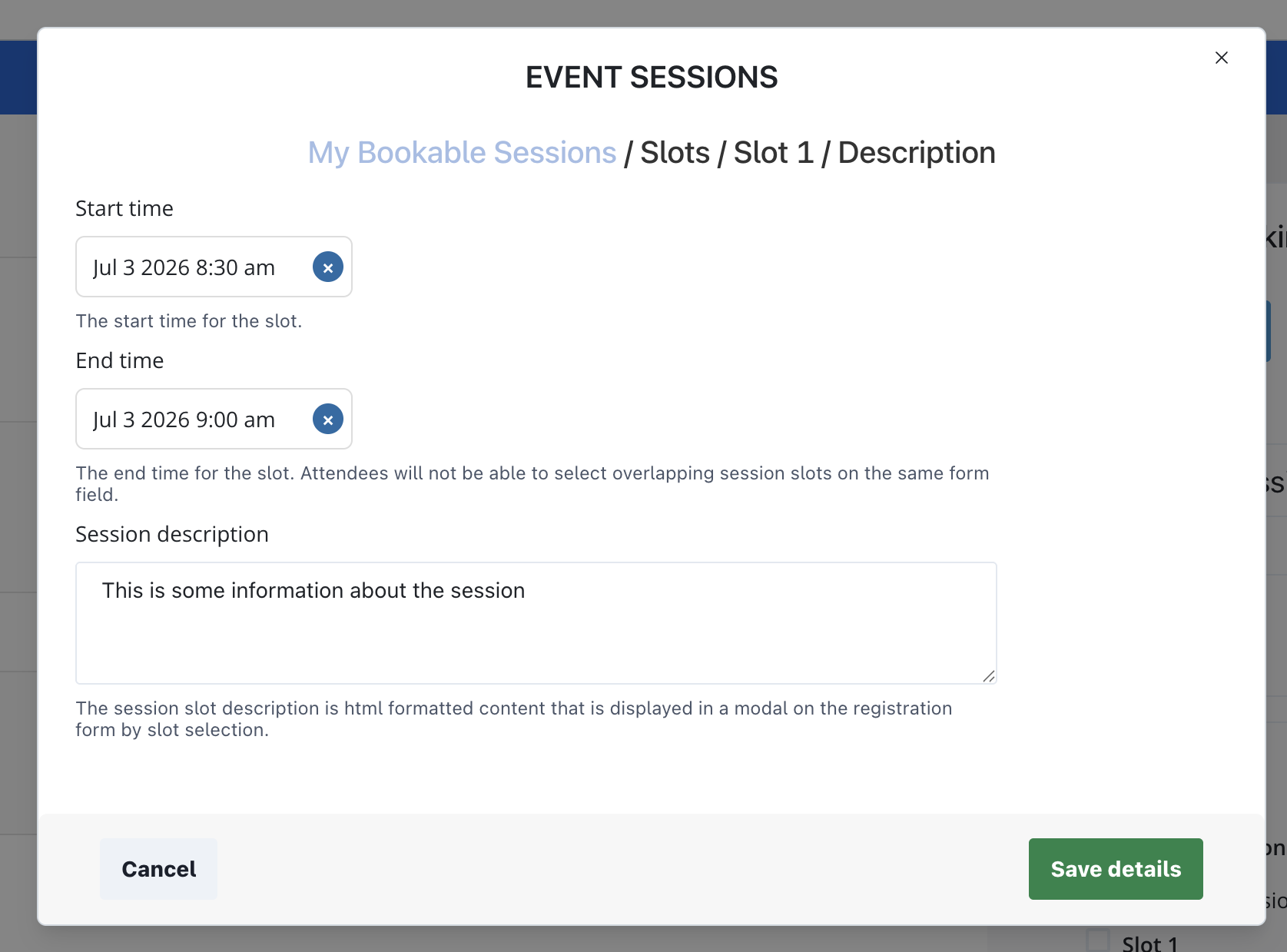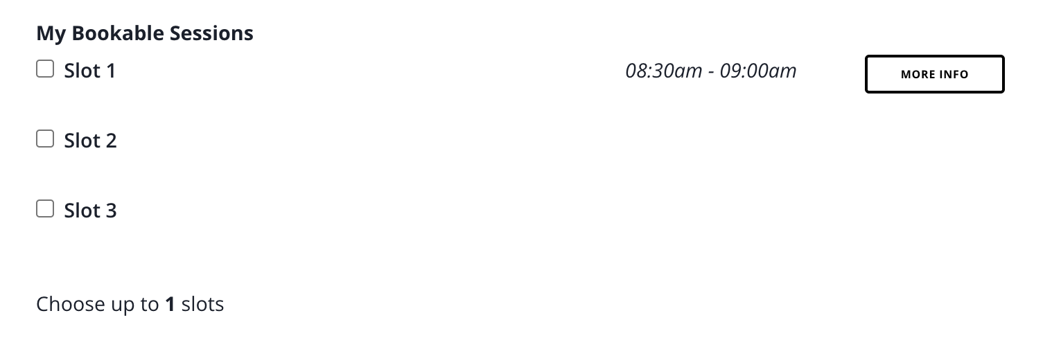 Setting a start and end time will display the slot times on the registration form the attendee to view. If you choose to add a 'Session description', a 'More info' button will be displayed on the registration form, and when an attendee clicks on it, they will see the description added displayed in a new window.