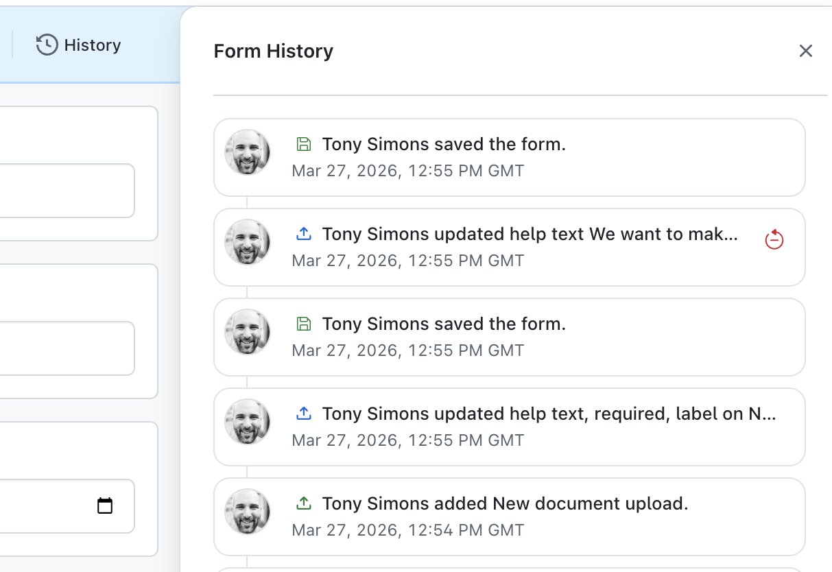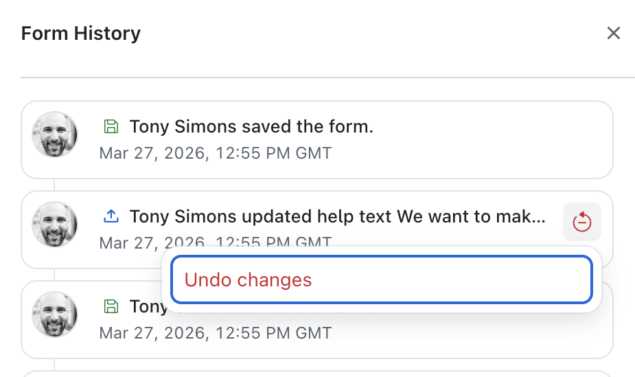 Your 'History' displays every change sorted by newest-first, showing exactly who made your changes and when. You can also undo changes made to your event form via the 'History' window by clicking on the red circular arrow icon with a '-' in the middle - simply select this and click 'Undo Changes' to revert the change: