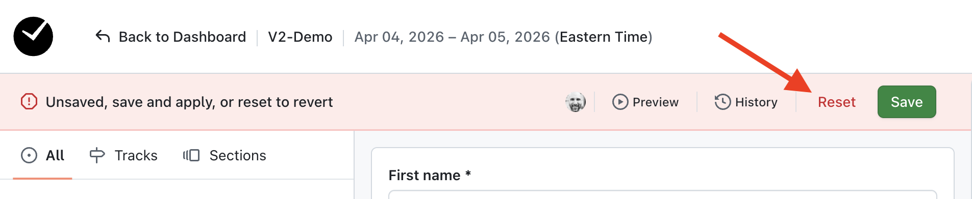 To revert any changes you have made while editing, click the 'Reset' option found on the status bar at the top of the page - this will reset your form to the state it was in the last time you saved.