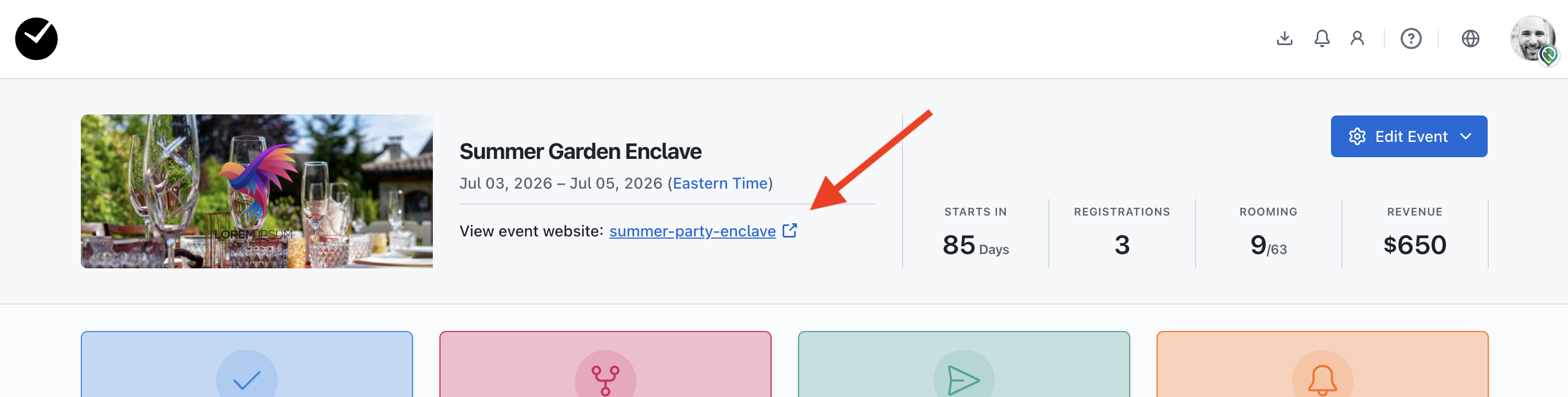 To preview your event website, you can click on the 'View Event Website' link at the top of your Event Dashboard: