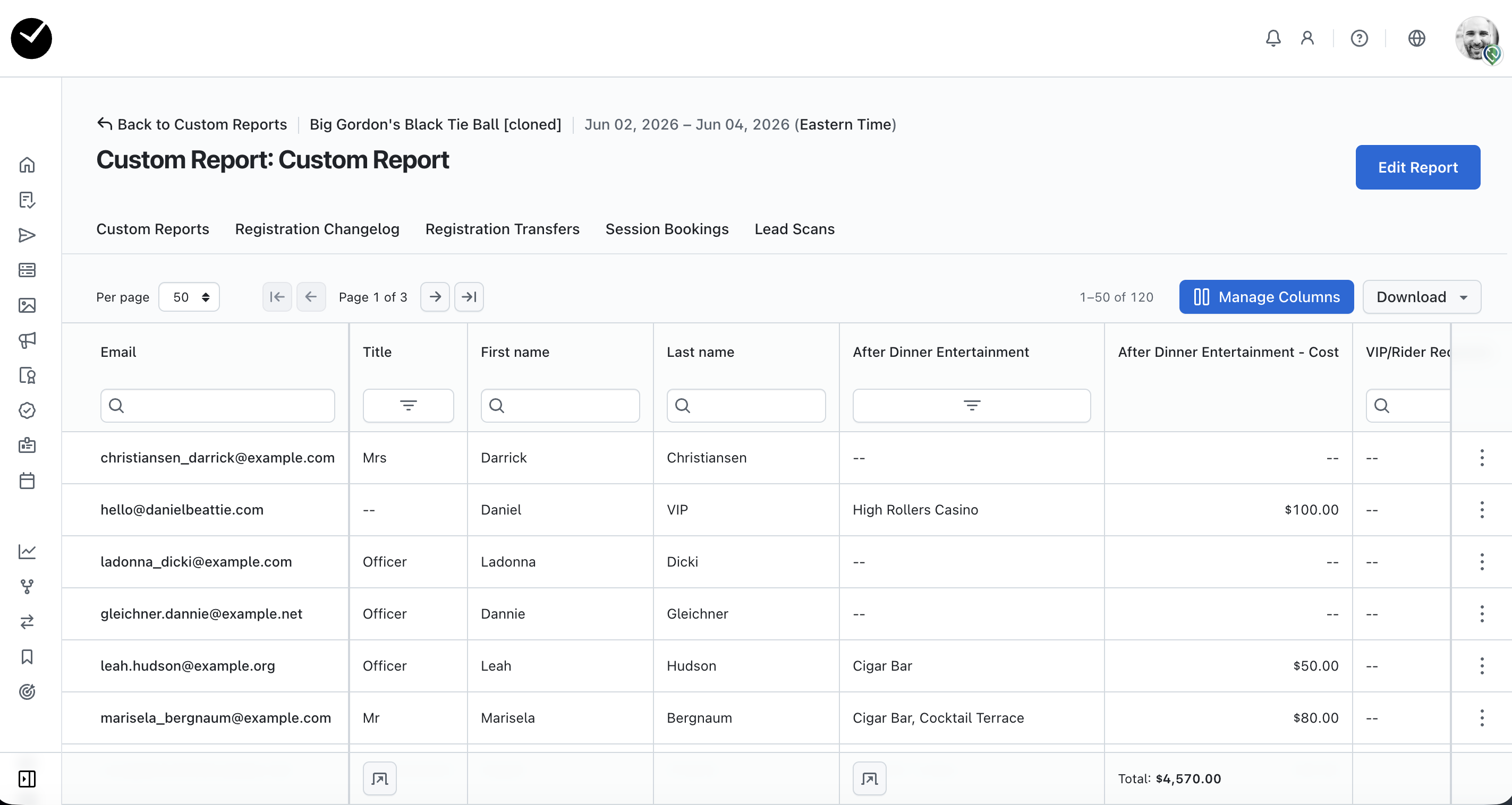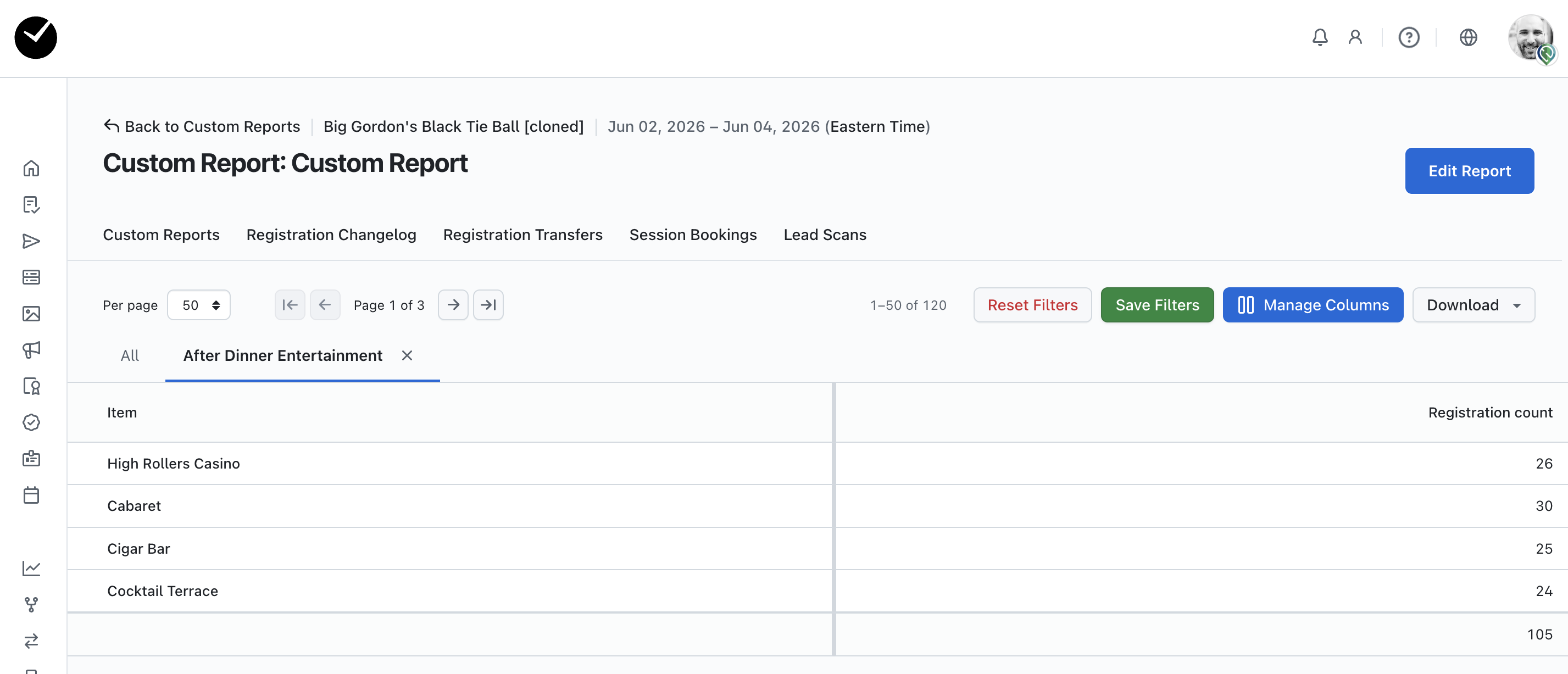 As an Admin user, you can create, view and download custom reports based on registrations made specifically for your events. Only Admin event users can create Reports for an event - as a Regular event user, you only can view Reports created for your event, and these are specified in your permissions by an Admin event user.