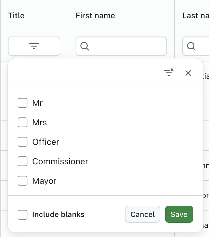 When you click on the button beneath the column title, a set of filter options are displayed - these will differ depending on the type of data you are filtering. For example, if the column data reflects something like a 'Title' (as shown in the screenshot below), you will see a set of checkboxes. If you select to filter a column containing dates, you will be provided with a set of date fields to create a ranged filter, and if there is a numerical value involved (eg fees or invoicing), you will also see a ranged filter available.