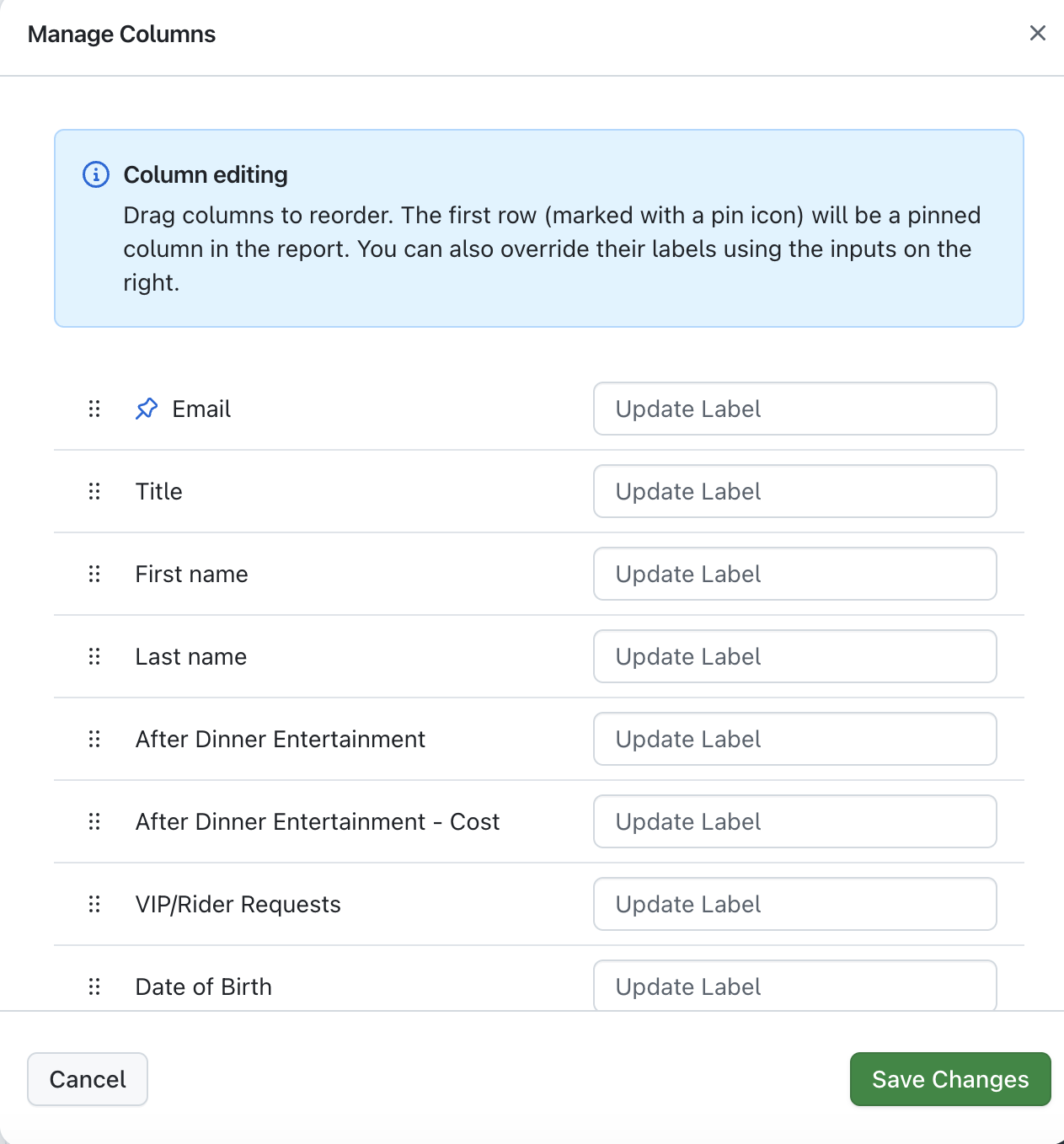 A new window will be displayed, and in this window, you can add new labels for your columns, as well as drag them into the order you wish them to be organized by. Just make your desired changes and click 'Save Changes' to have your changes applied to the report. iI you choose to download a report with columns that have been renamed/re-arranged, the report received will have the saved changes applied.