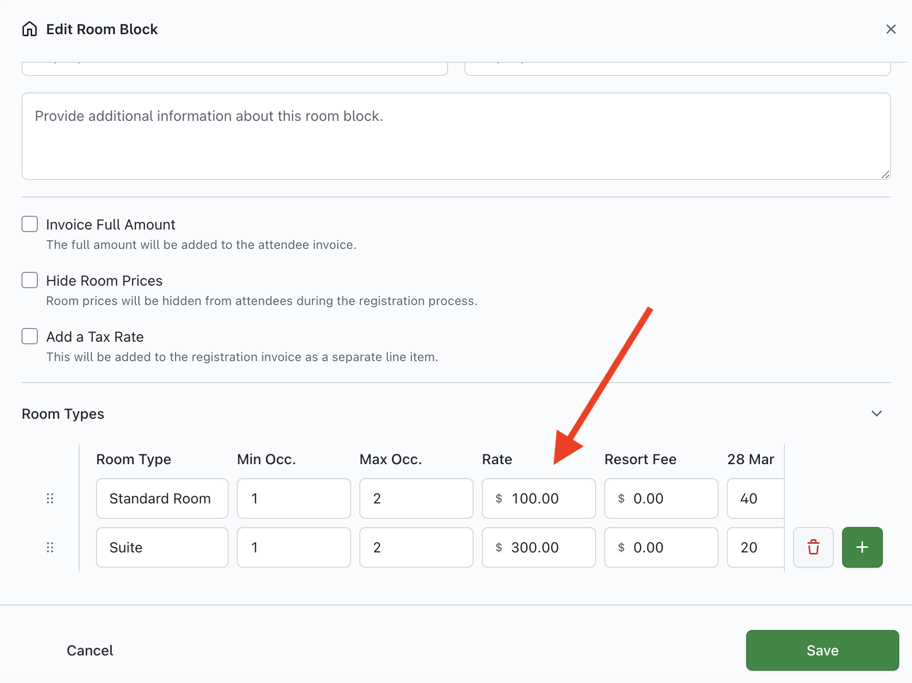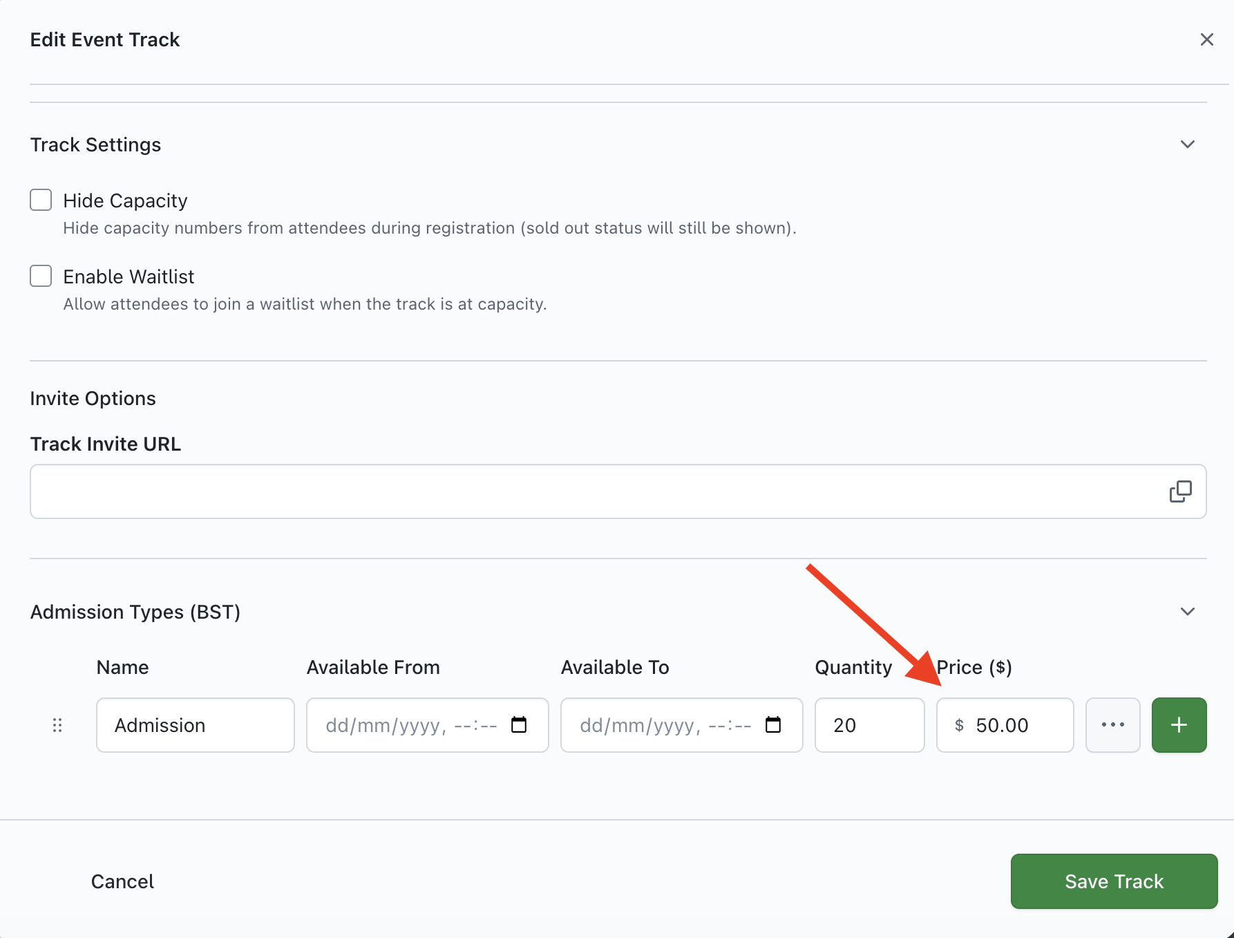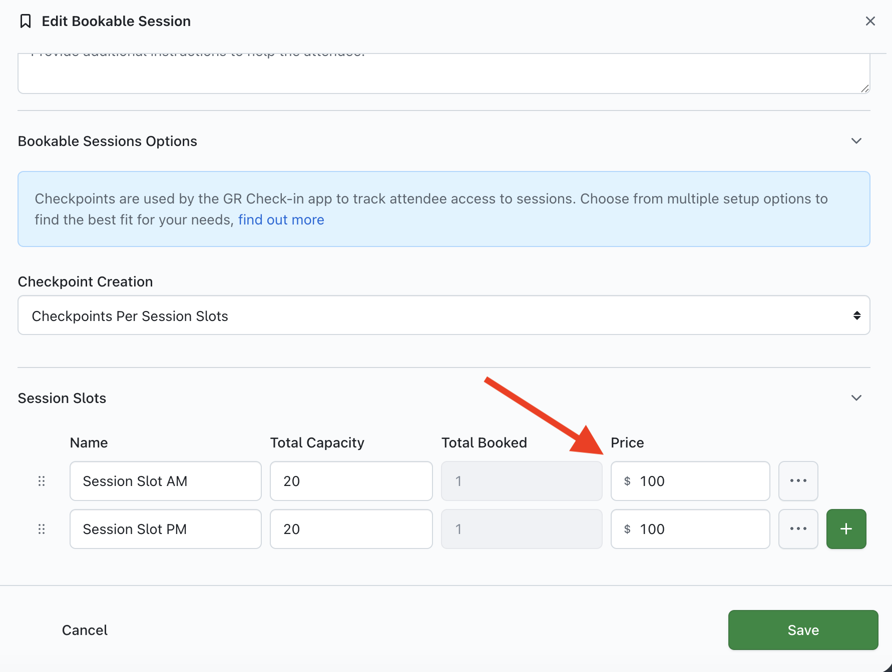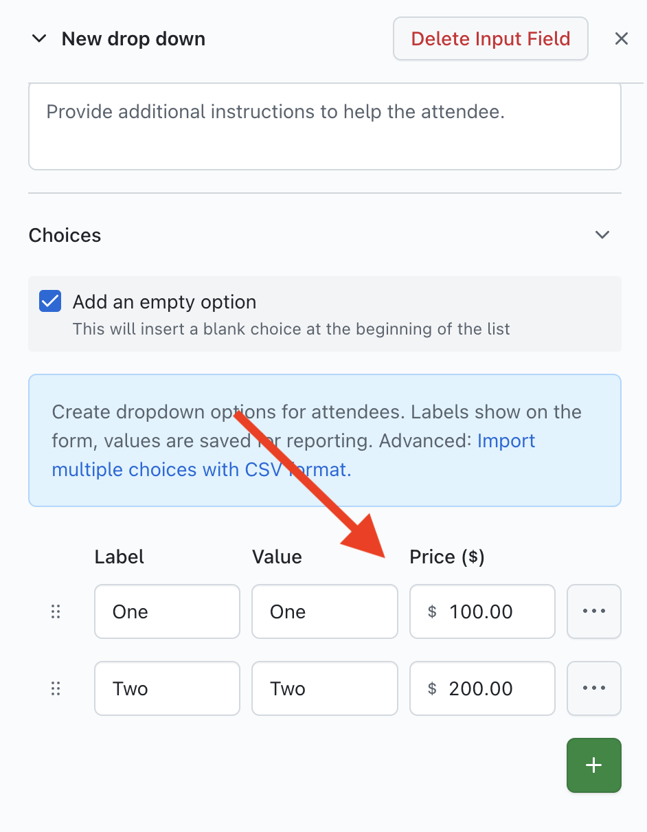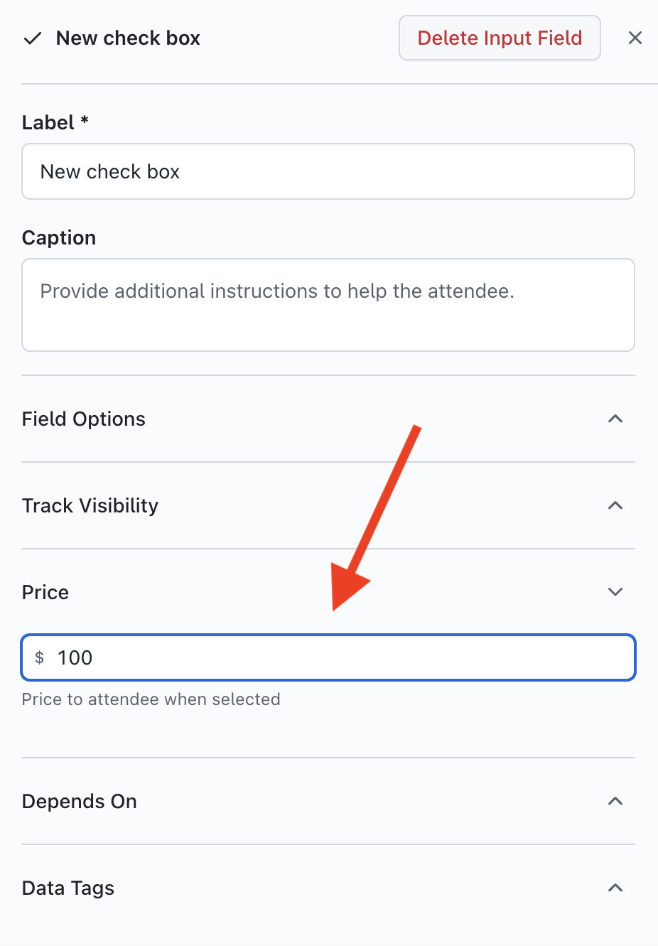 Once the 'Fee & Payments Enabled' option has been enabled in your Event Settings, you can now add 'prices' in your event Registration Form. When building or editing your registration form you can assign monetary values to the following areas to collect payments from attendees: