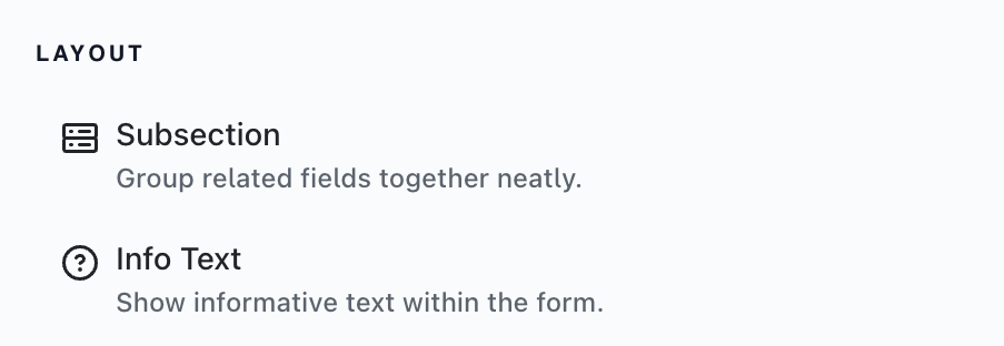 - Subsection - add a subsection to an event form 'Section', allowing you to group fields/inputs/widgets in one area. Fields/inputs/widgets can be organised by 'drag and drop'.