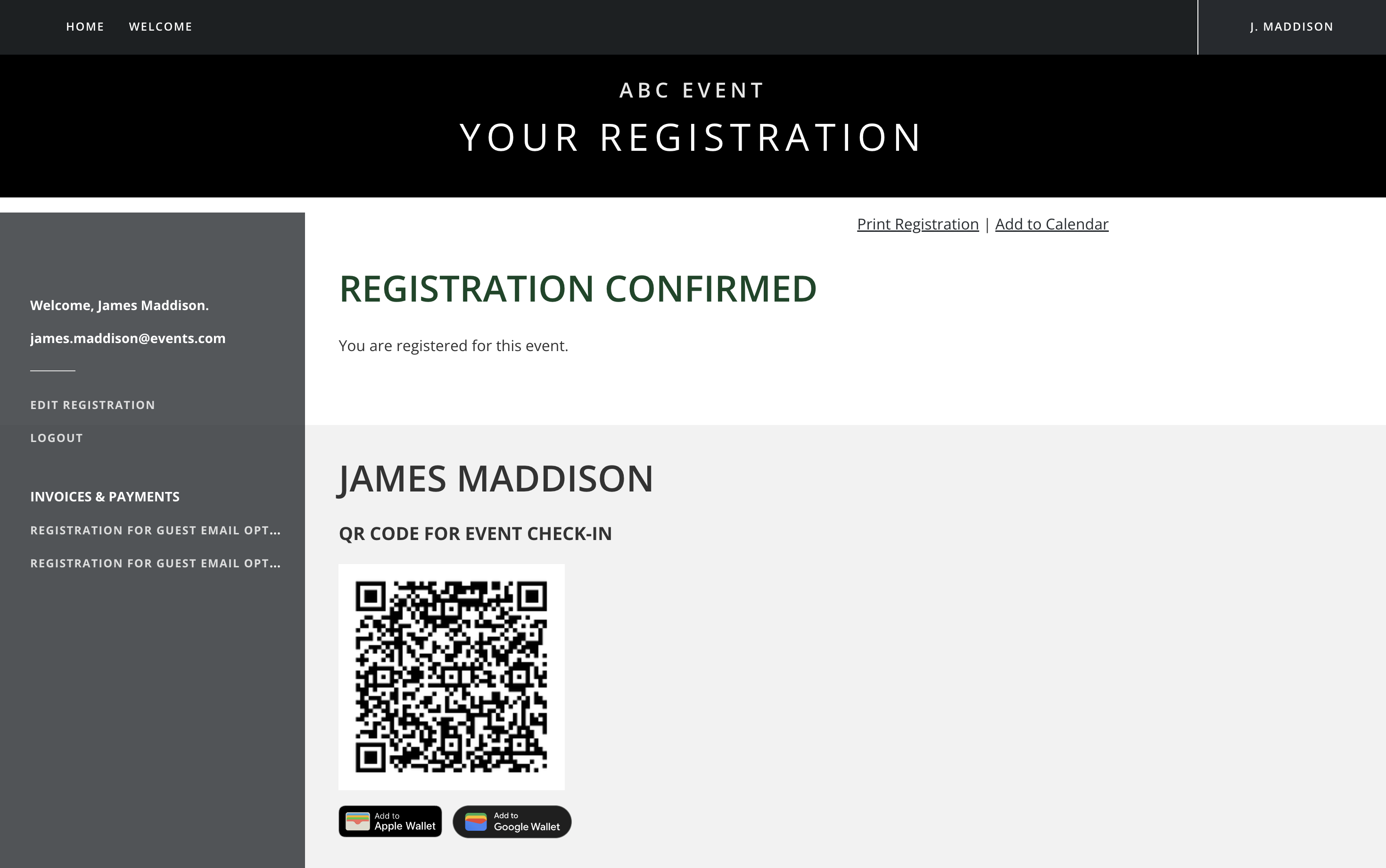 If you have enabled QR codes for your events then your guests can show the QR code that they receive on completing the registration form as a ticket. This is available on the attendee's registration 'show' page, as well as their registration confirmation email. The attendee can download the QR code to a mobile device if desired (both Apple and Google Wallet are supported).