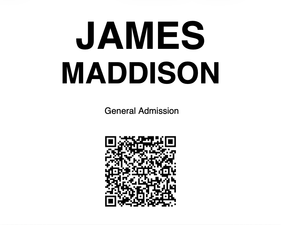 Additionally, if you are using our 'Name Badges' feature in conjunction with your event, with QR codes enabled and a suitable name badge template selected, the unique QR code created for an attendee will be present on their name badge when printed as well, eg: