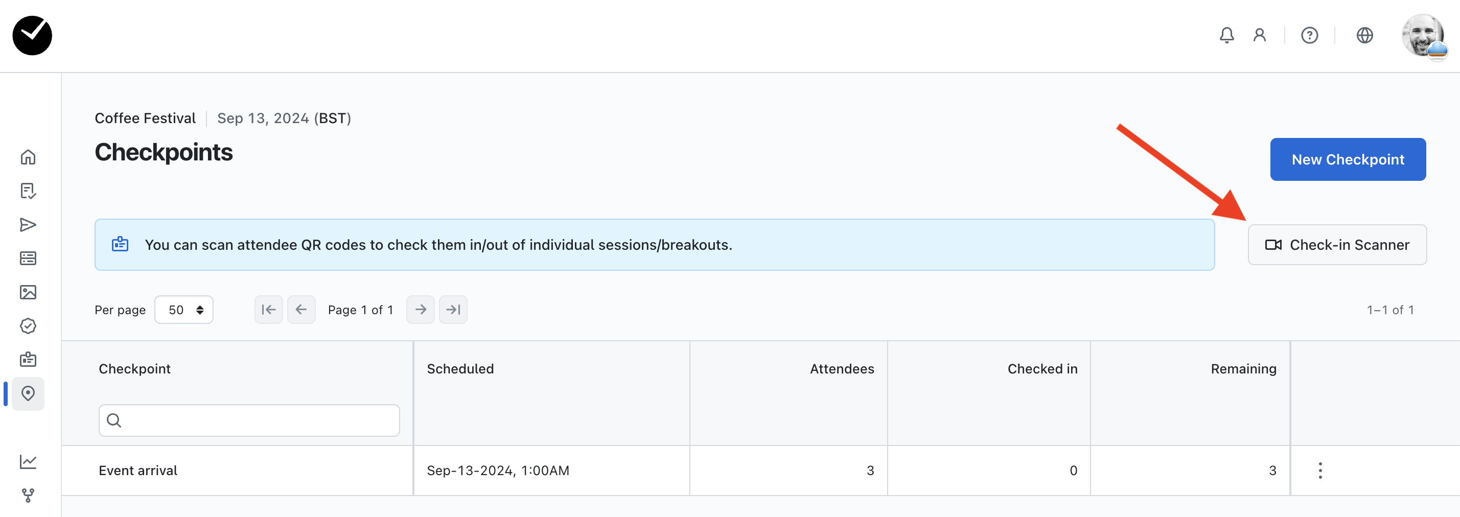 You can also enable the Check-in Scanner for individual checkpoints by clicking on the 3 dots at the end of any checkpoint and selecting 'Scan Tickets':