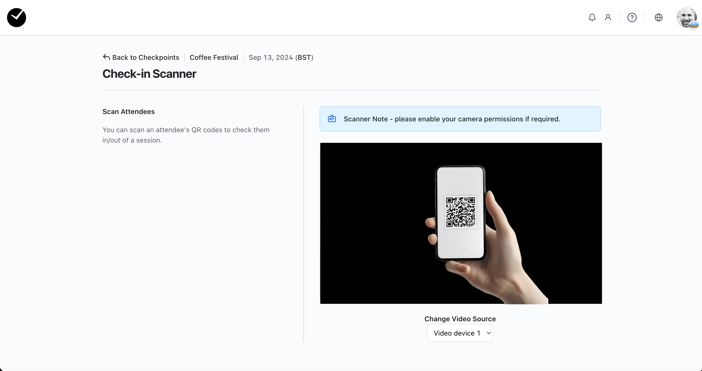 Once you have selected to begin scanning, you will be asked to permit access to your device's camera, and once allowed, you can begin scanning attendee QR codes. You will see a small video window on the main area of the page that will allow you to easily align the QR code to be read. Simply align the QR code with the window and the attendee check in/out will be captured in your event: