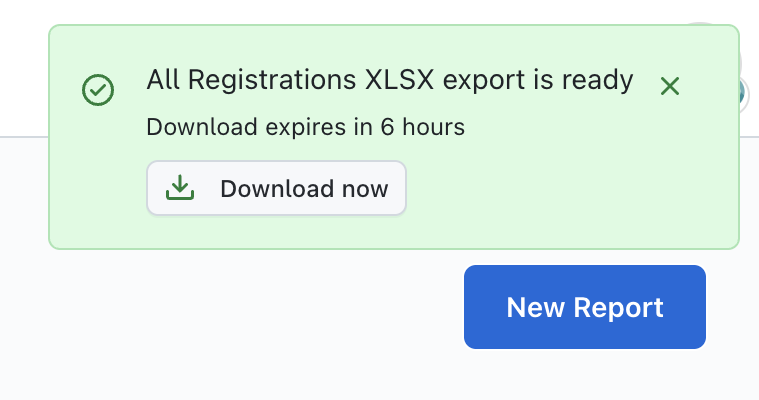 When a custom report is ready to be downloaded, you will see a pop-up notification displayed on the top right of the page, as well as a green dot displayed next to the download tray.