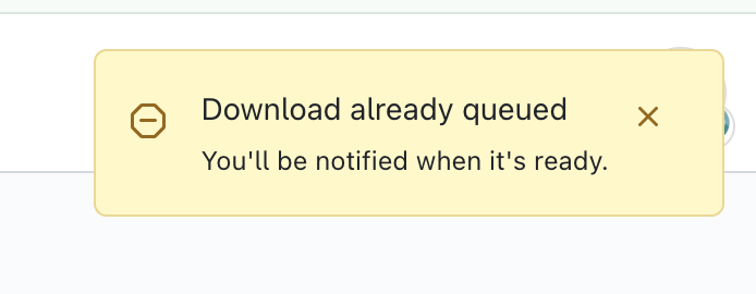 If you attempt to submit to download a report that is already in a state of 'Queued' or 'Processing', you will see the following pop-up informing you that it is already queued for downloading. When your report download is ready, you will be notified immediately.