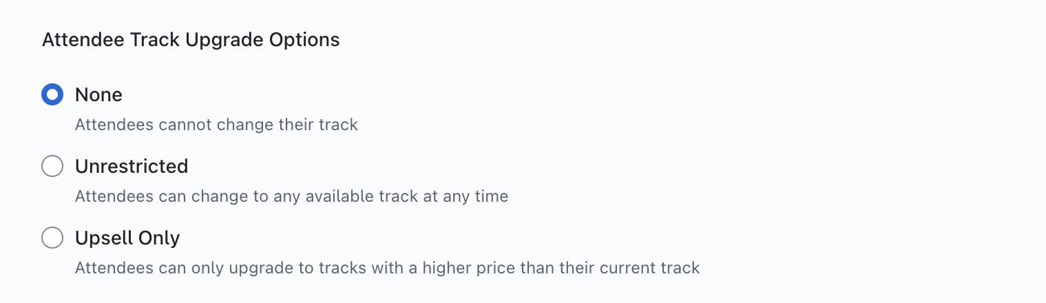 Selecting the option 'Unrestricted' will allow attendees to make unlimited track changes on their registration (depending on track availability/visibility). If you select 'Upsell Only', when an attendee selects to change their track, they will only be able to choose a track of higher value than their current choice.