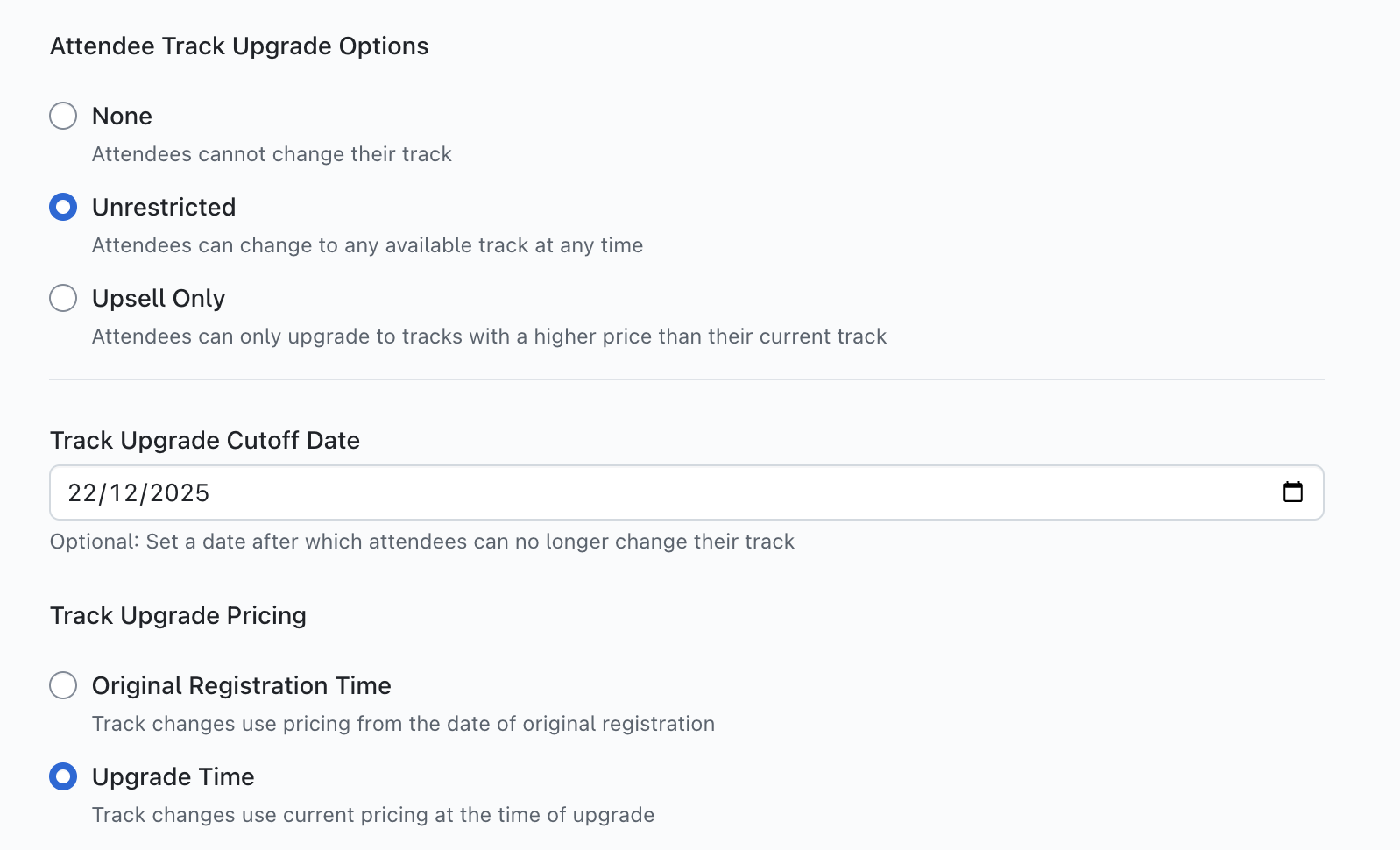 To limit when when an attendee can change their track, simply click on the 'Track Upgrade Cutoff Date' field and select a date - once this date is reached, attendees will no longer be able to change their track unless you change or remove this date in your settings.