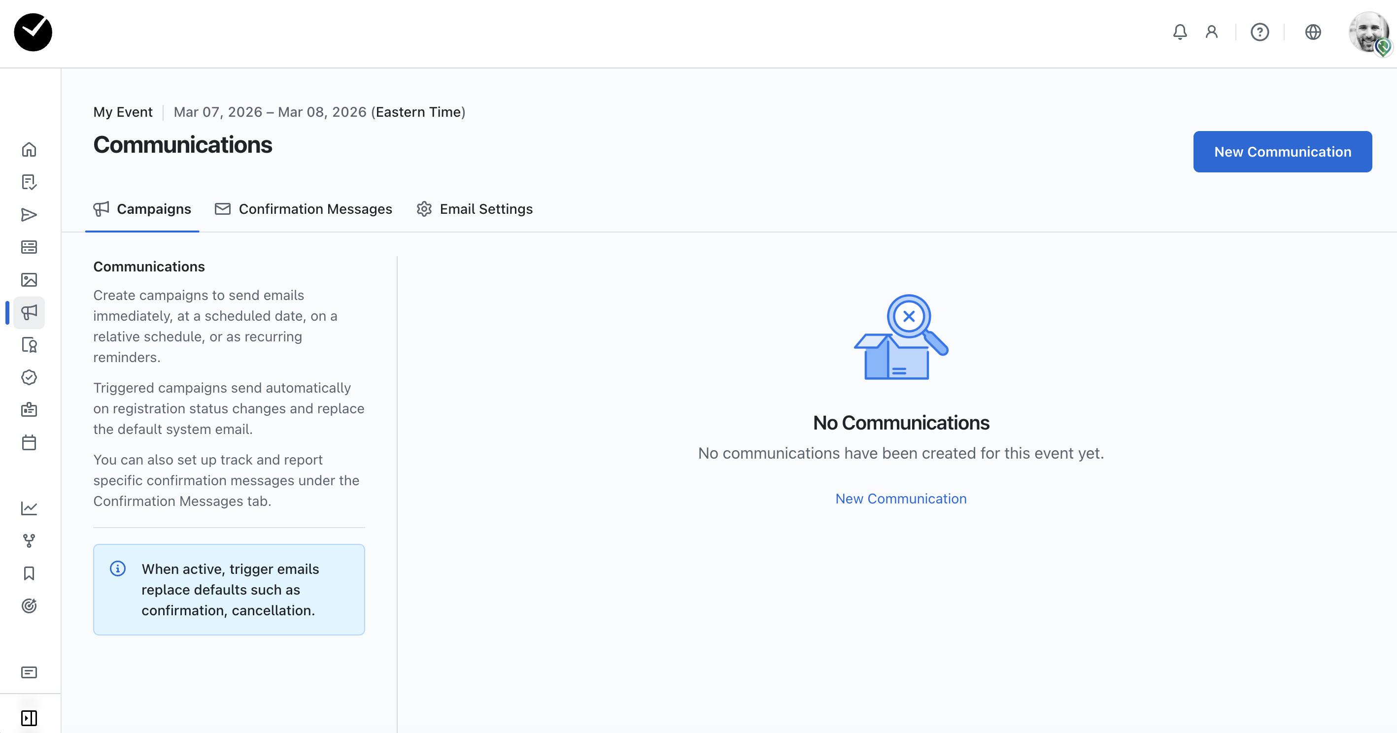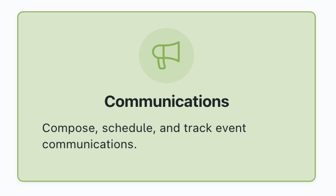 getregistered has an custom email creator feature available for your events, that allows you to create and schedule emails for your attendees - Communications. If your organization has the 'Communications' feature enabled, you will see the following tile available in your Event Dashboard.