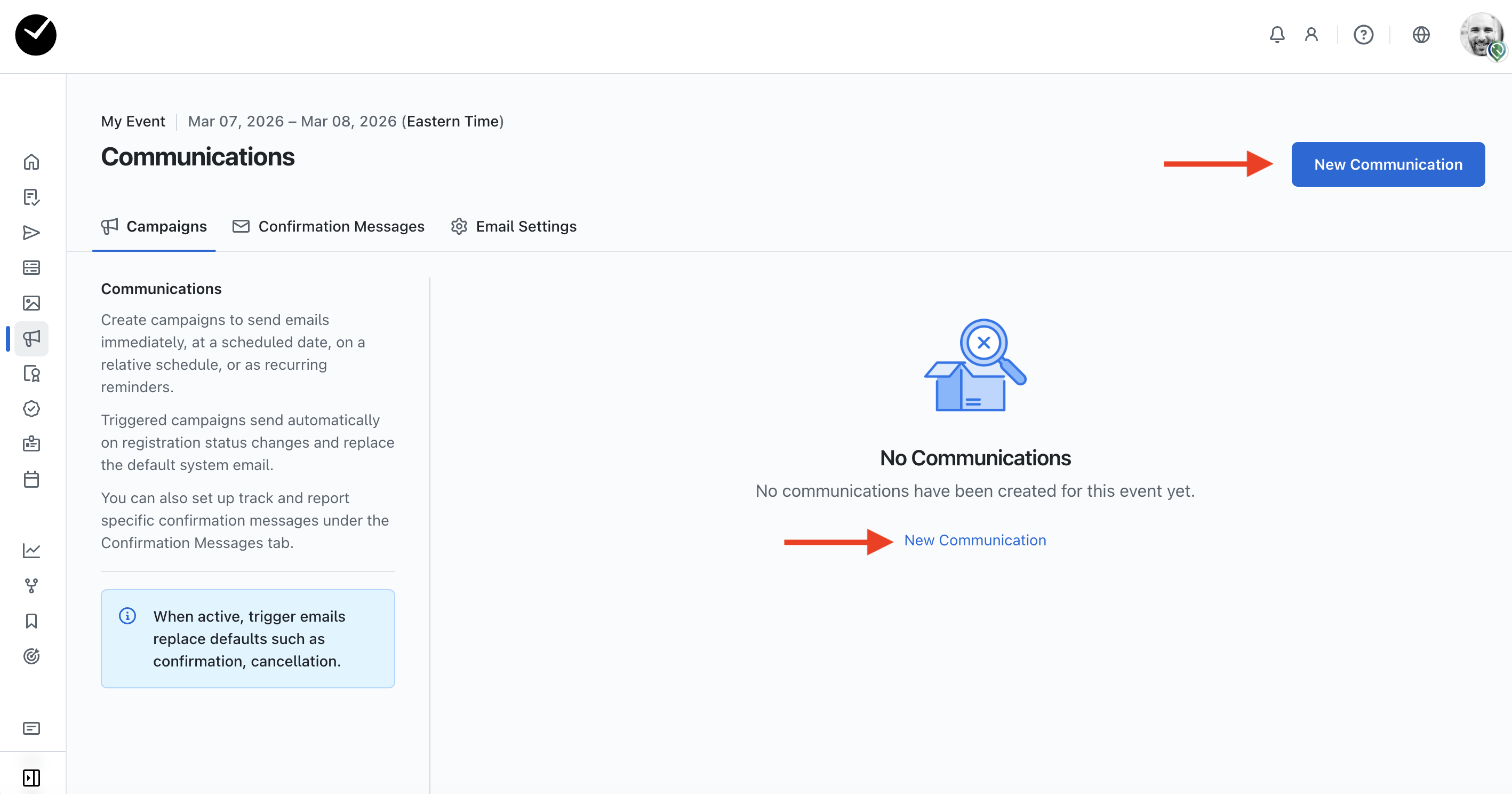 To begin creating your email campaign, click on the 'New Communication' button at the top right of the page (or alternatively, click on the 'New Communication' text on the center of the page if you have no previously created campaigns):