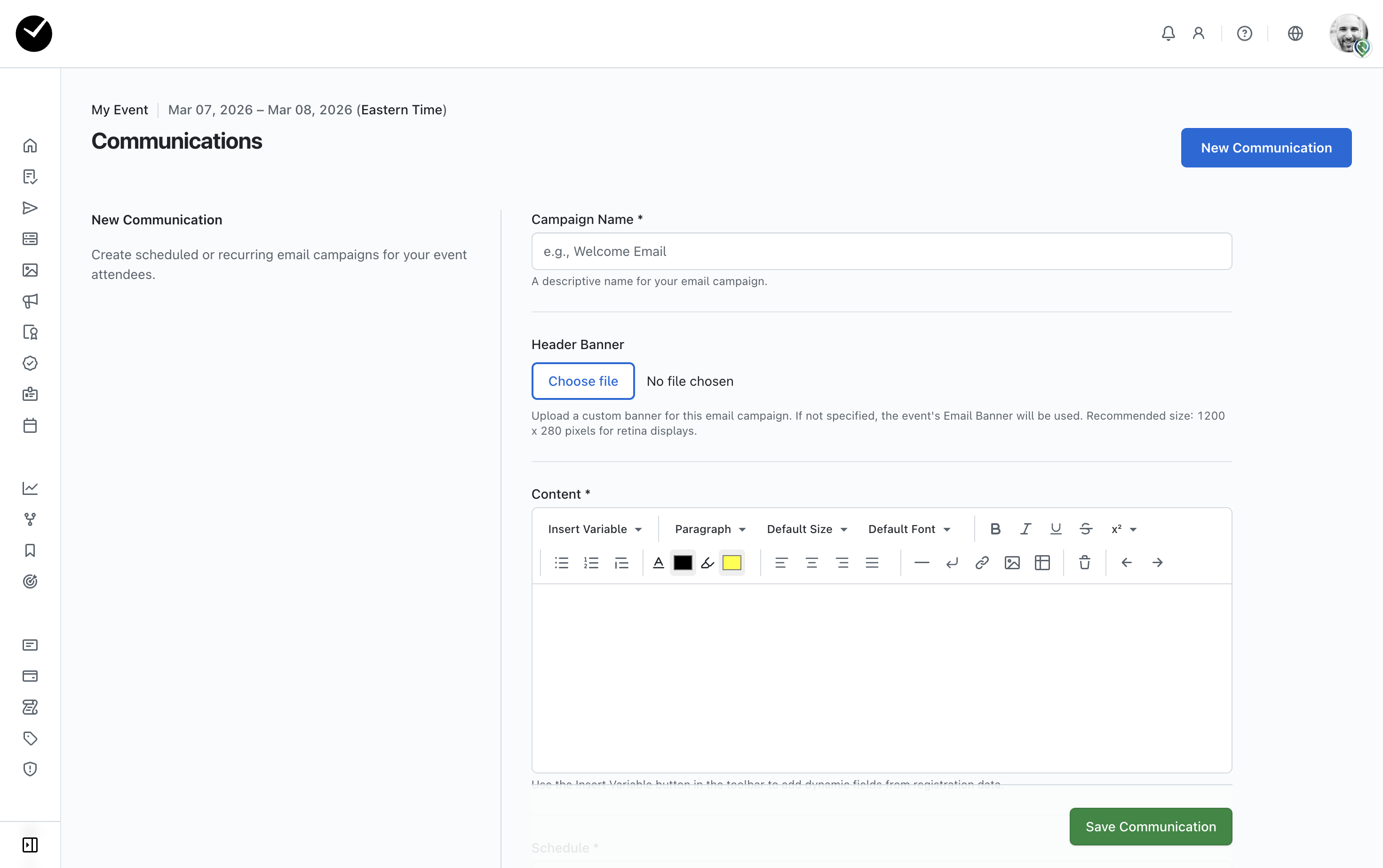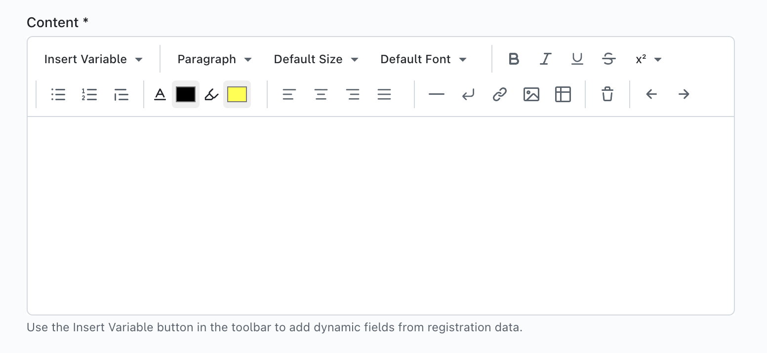 - Content - this area is where you will create your email content. The Content editor empowers you to be able to create beautiful emails with little to no effort, and also create personalizations using the 'Insert Variable' option (which is discussed more in-depth later in this article). This is a mandatory feature, you must add content here to be able to save your email communication.
