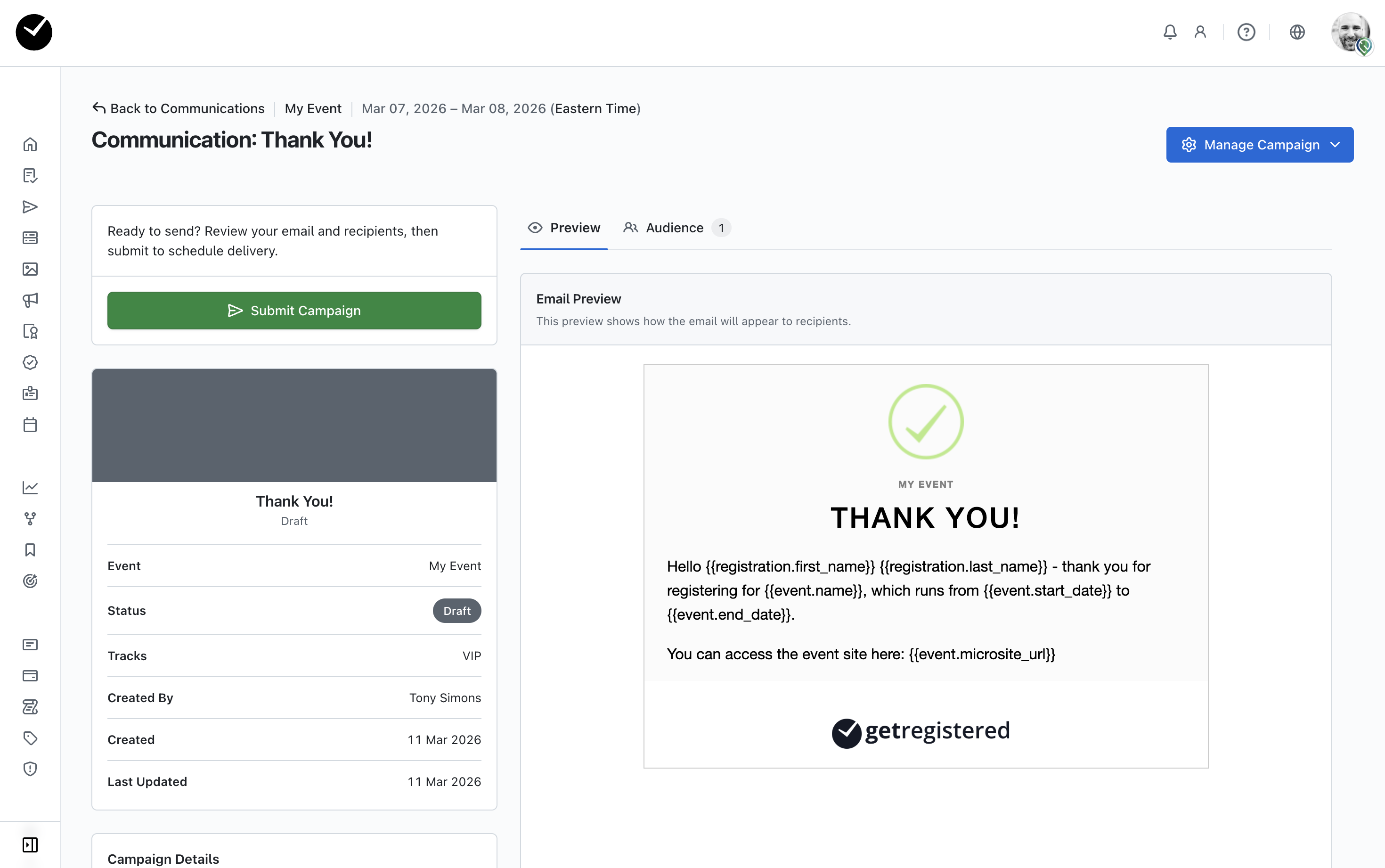 The main area of the page shows a preview of your email as your attendees will see it. You can also view the campaign audience list by selecting the 'Audience' tab near the top of the page.