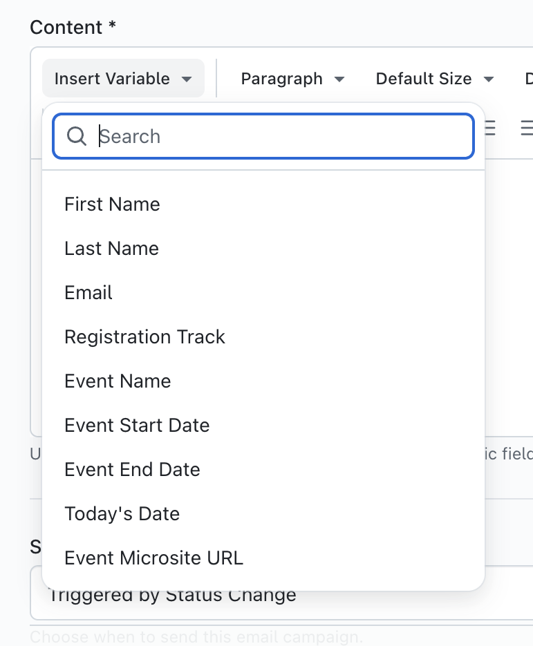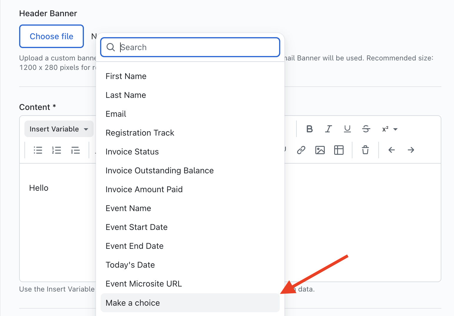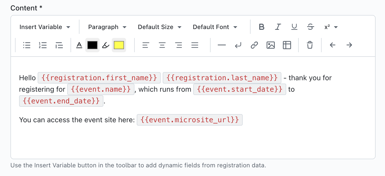 Selecting this option provides you a list of pre-prepared variables you can select to add to the email, which will be replaced by the relevant data in our system for your event when delivered. Using these variables, you add a personal touch to your email campaign without quickly and easily, eg: