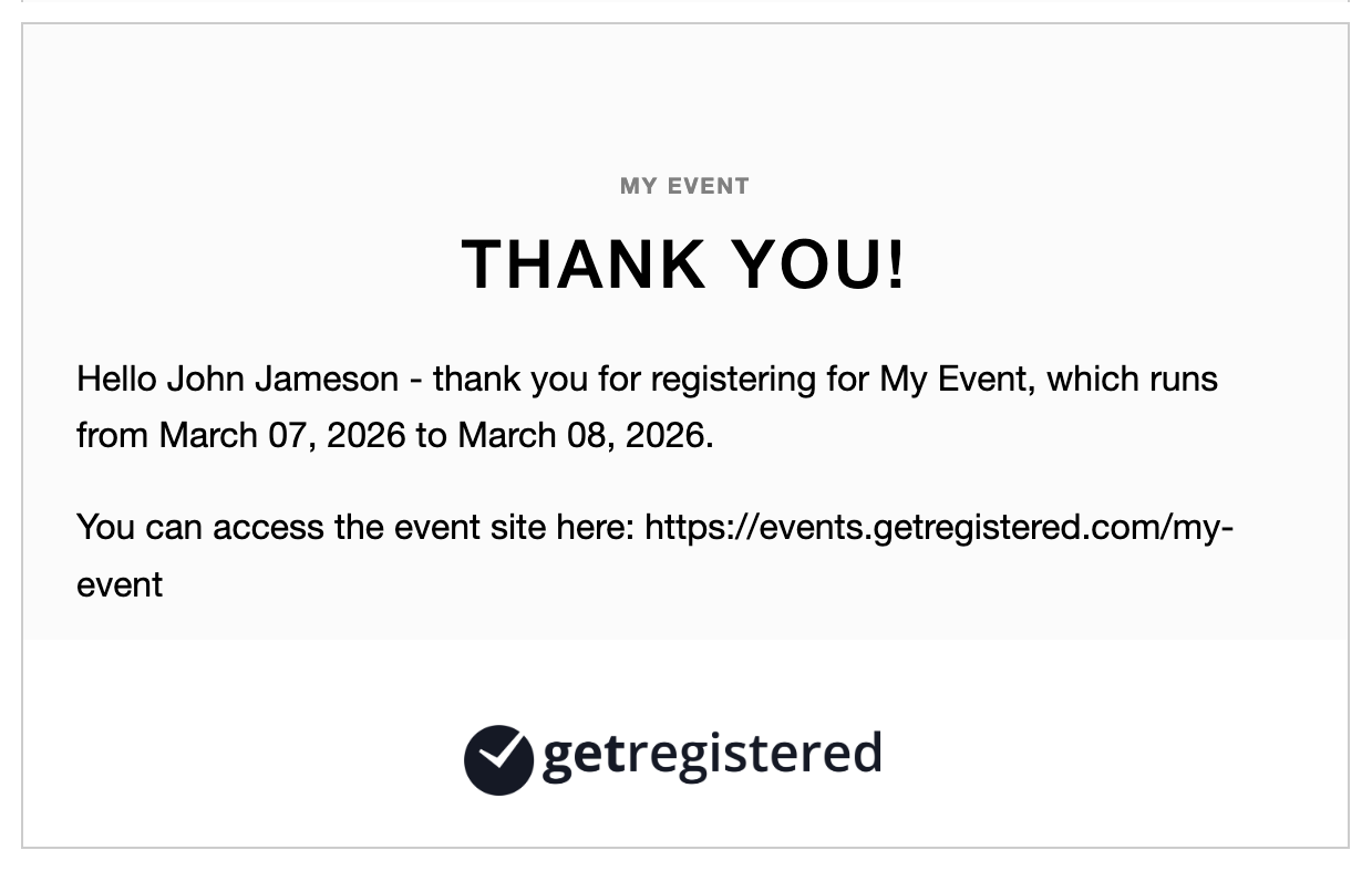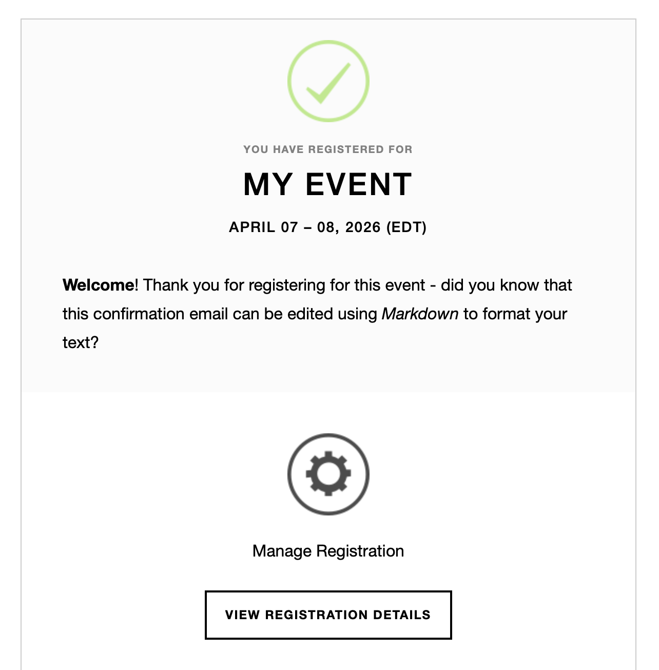 If you selected your custom message to be enabled, your message will now be active, and any attendees receiving a confirmation email will see your new message in notification, eg: