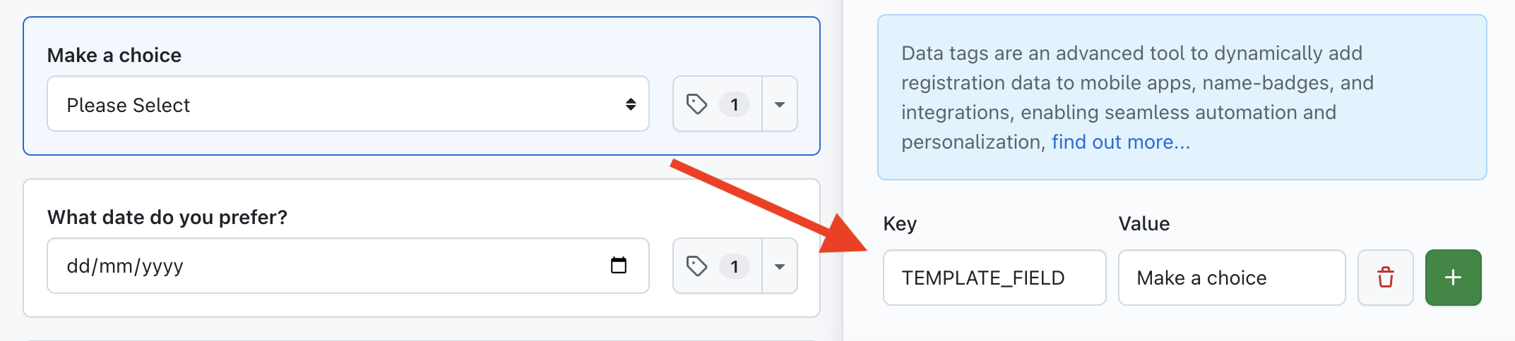 You can even add your own variables based on your event form fields - simply select a field, and click on the 'Data Tags' option. In the 'Key' Field, enter the text TEMPLATE_FIELD , and then enter a name for the variable into the 'Value' field and save your changes.