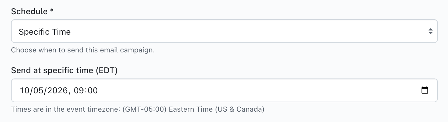 - Specific Time - will deliver the email to your intended audience on the specified date and time. Please note this schedule will be based on the timezone your Event Timezone is set to.